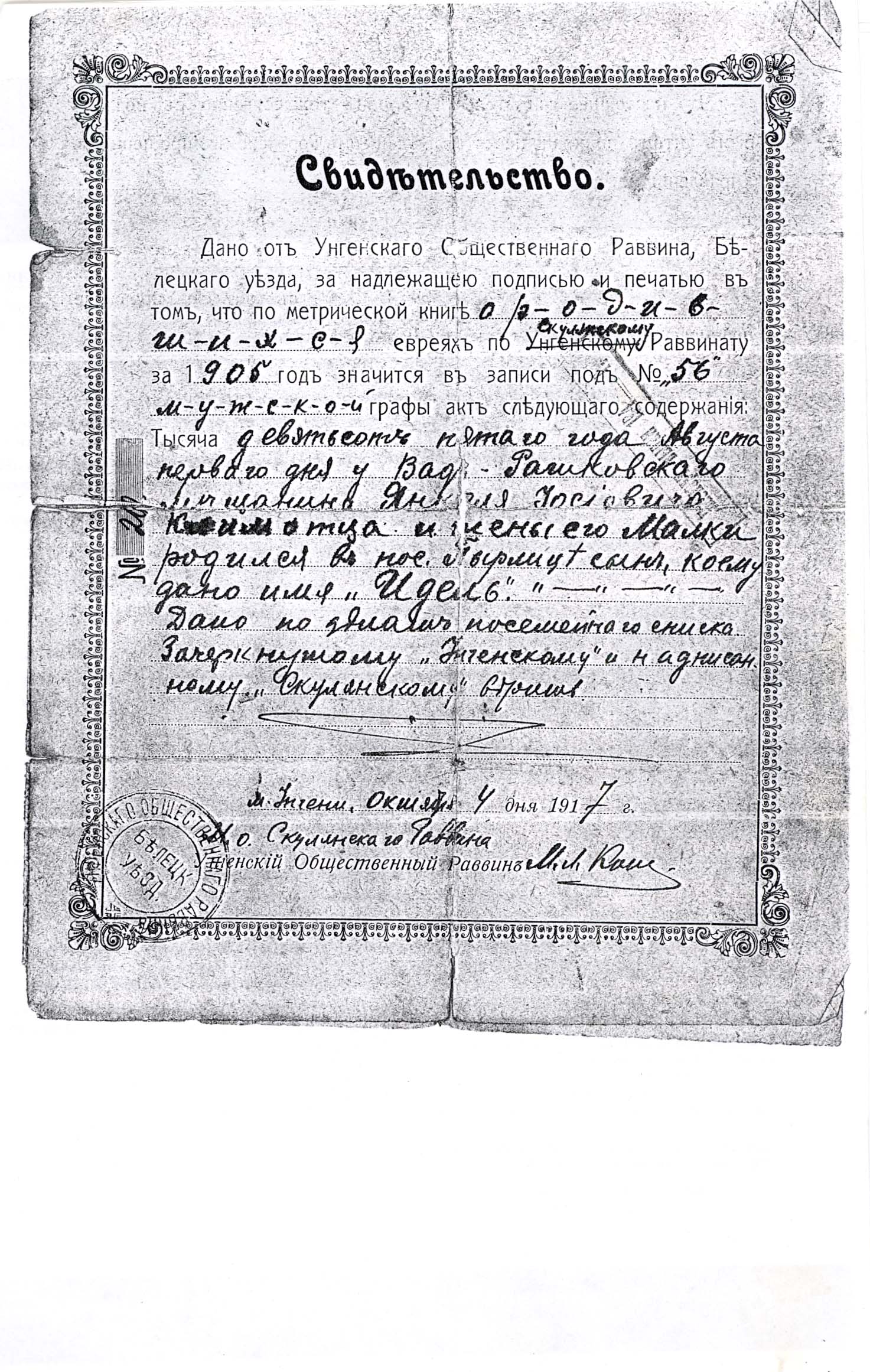 Idel Klimautzki wurde im Jahr 1905 in Parliti Targ, Rumänien geboren. Er war Comersanta. Vor dem Zweiten Weltkrieg lebte er in Parliti Targ, Rumänien.