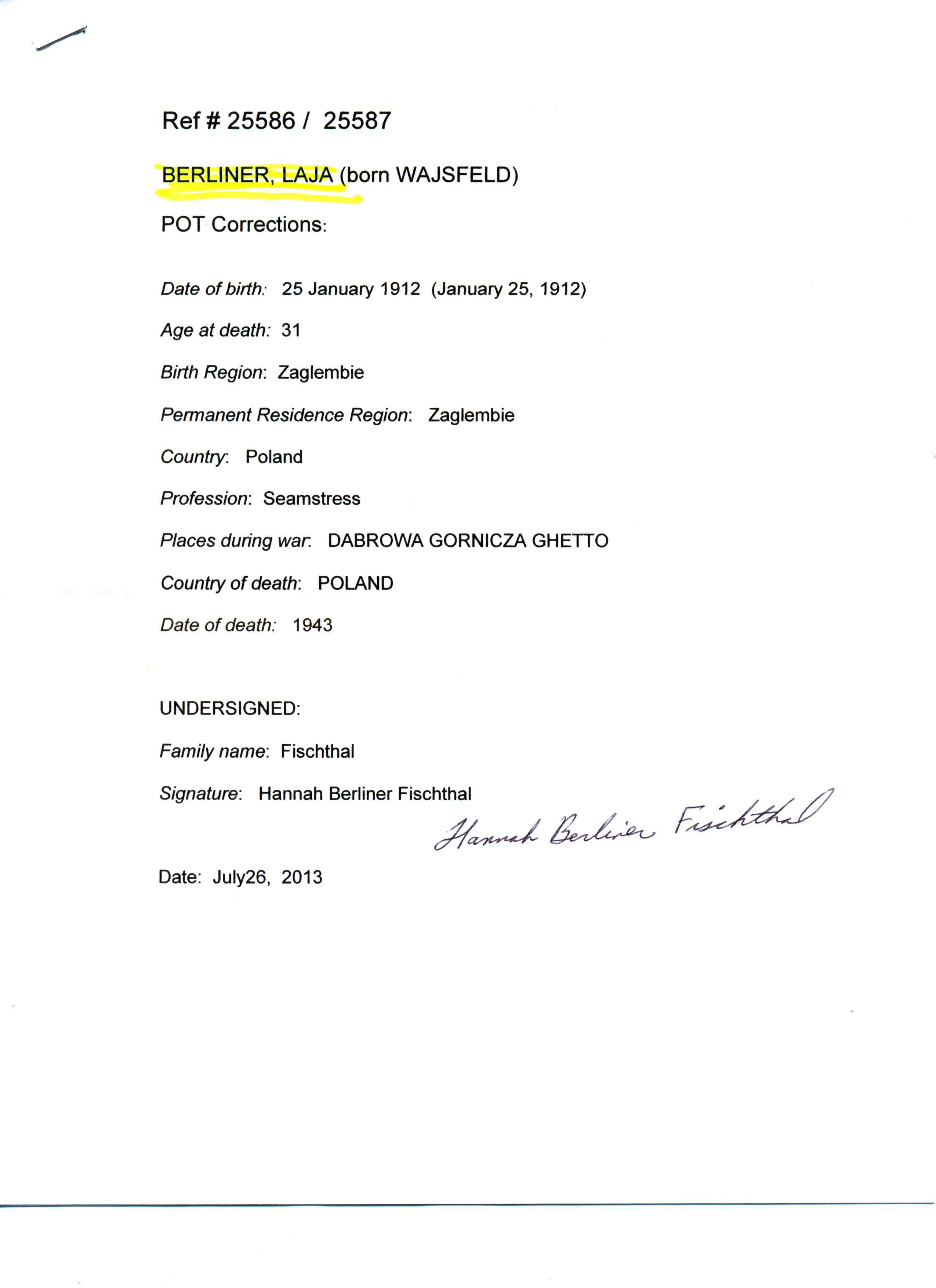 Laja Berliner, geb. Wajsfeld wurde im Jahr 1912 in Wolbrom, Polen geboren. Sie war Schneiderin. Vor dem Zweiten Weltkrieg lebte sie in Dabrowa Gornicza, Polen.