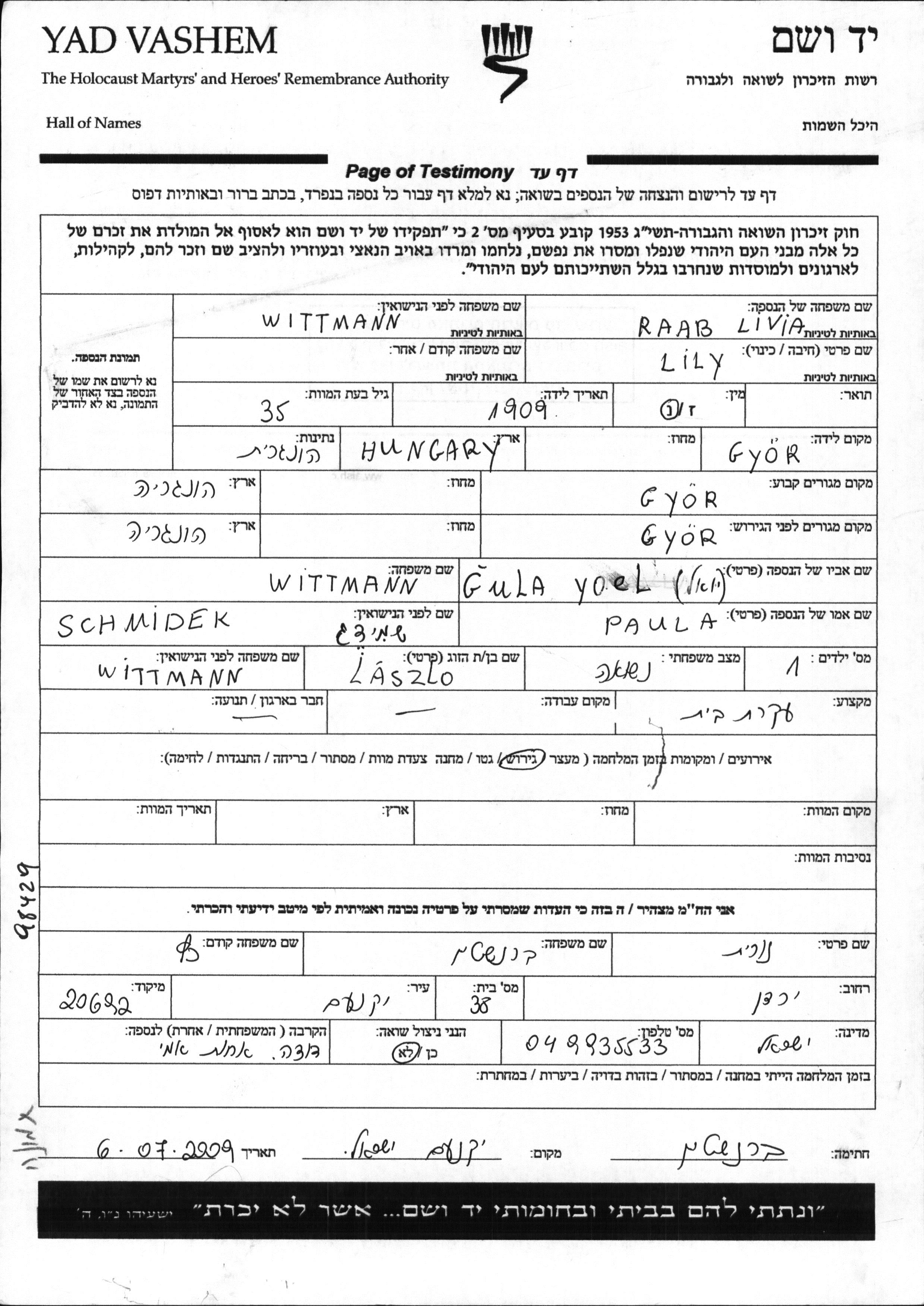 Livia Lily Raab, geb. Wittmann wurde im Jahr 1909 in Gyor, Ungarn geboren. Sie war Hausfrau. Vor dem Zweiten Weltkrieg lebte sie in Gyor, Ungarn.