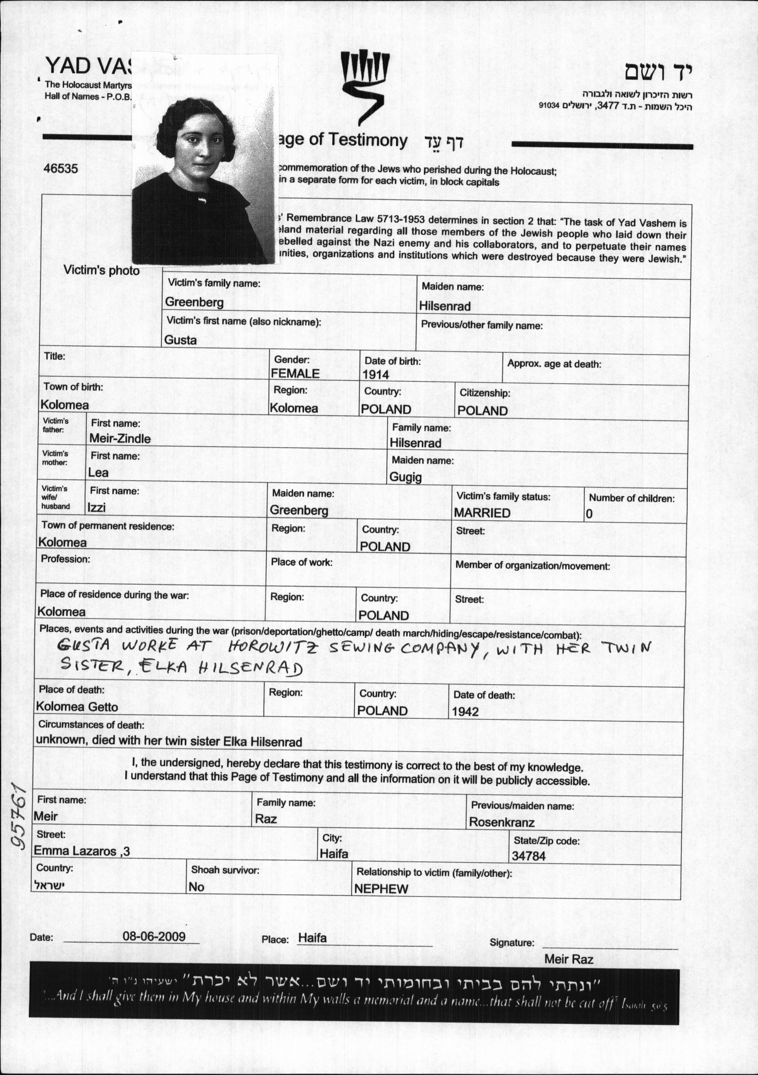 Greenberg | Gusta | 1914 | Kolomea, Polen | Gedenkblatt (digital, unterzeichnet) |