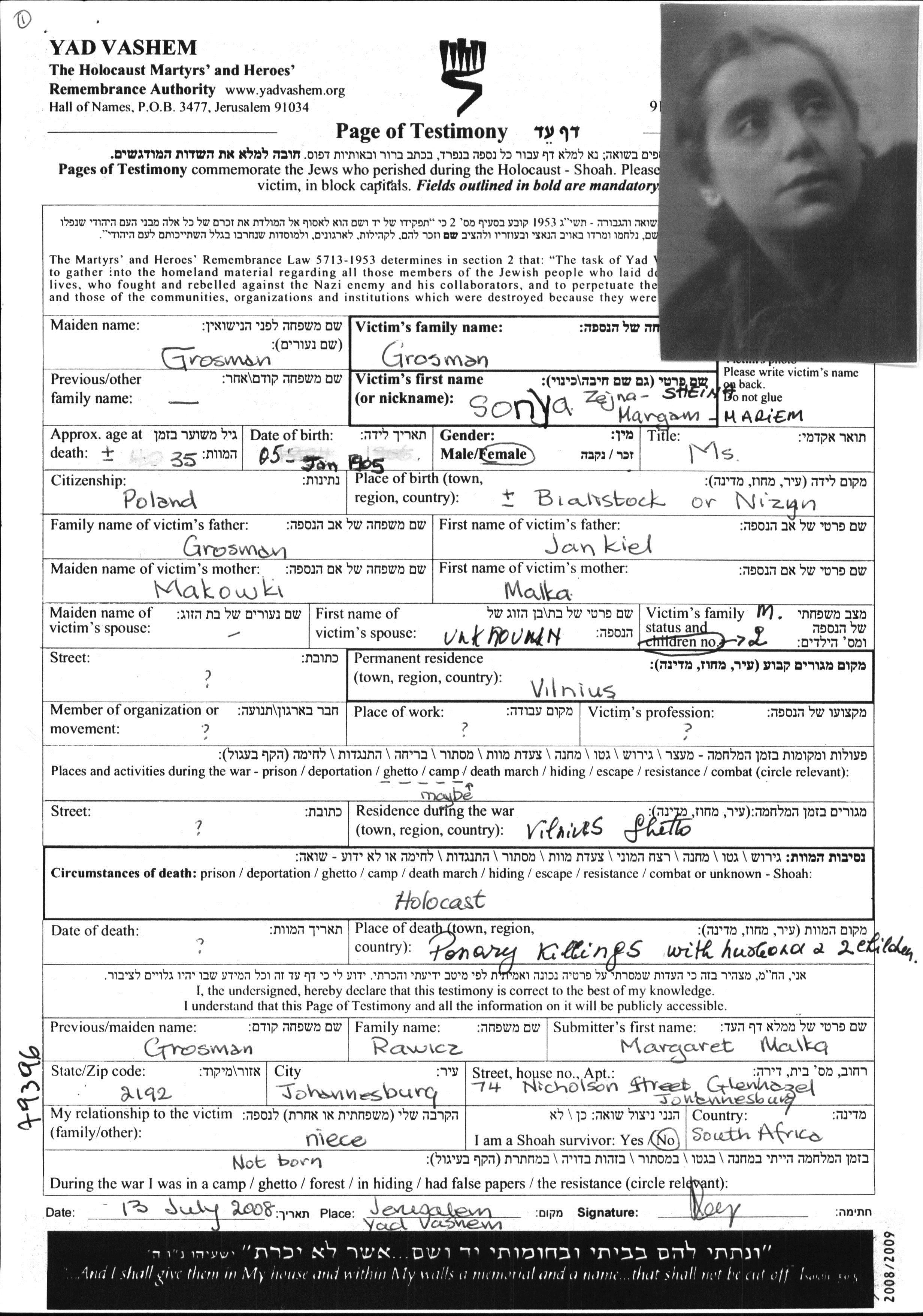 Sonya Sheina Mariem Zejna Grosman wurde im Jahr 1905 in Bialystok, Polen geboren. Vor dem Zweiten Weltkrieg lebte sie in Wilno, Polen.
