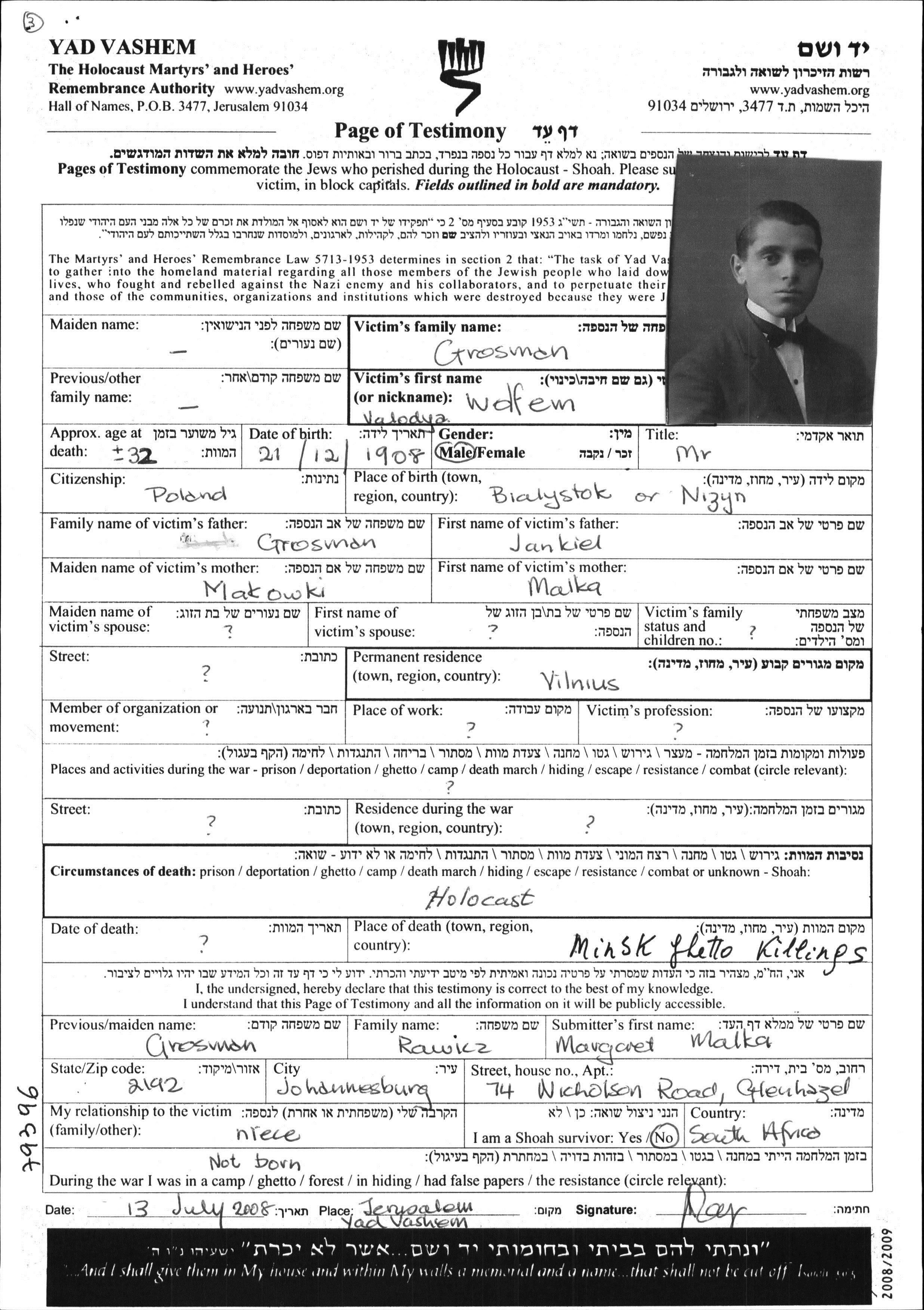 Wolfem Volodya Grosman wurde im Jahr 1908 in Bialystok, Polen geboren. Vor dem Zweiten Weltkrieg lebte er in Wilno, Polen.
