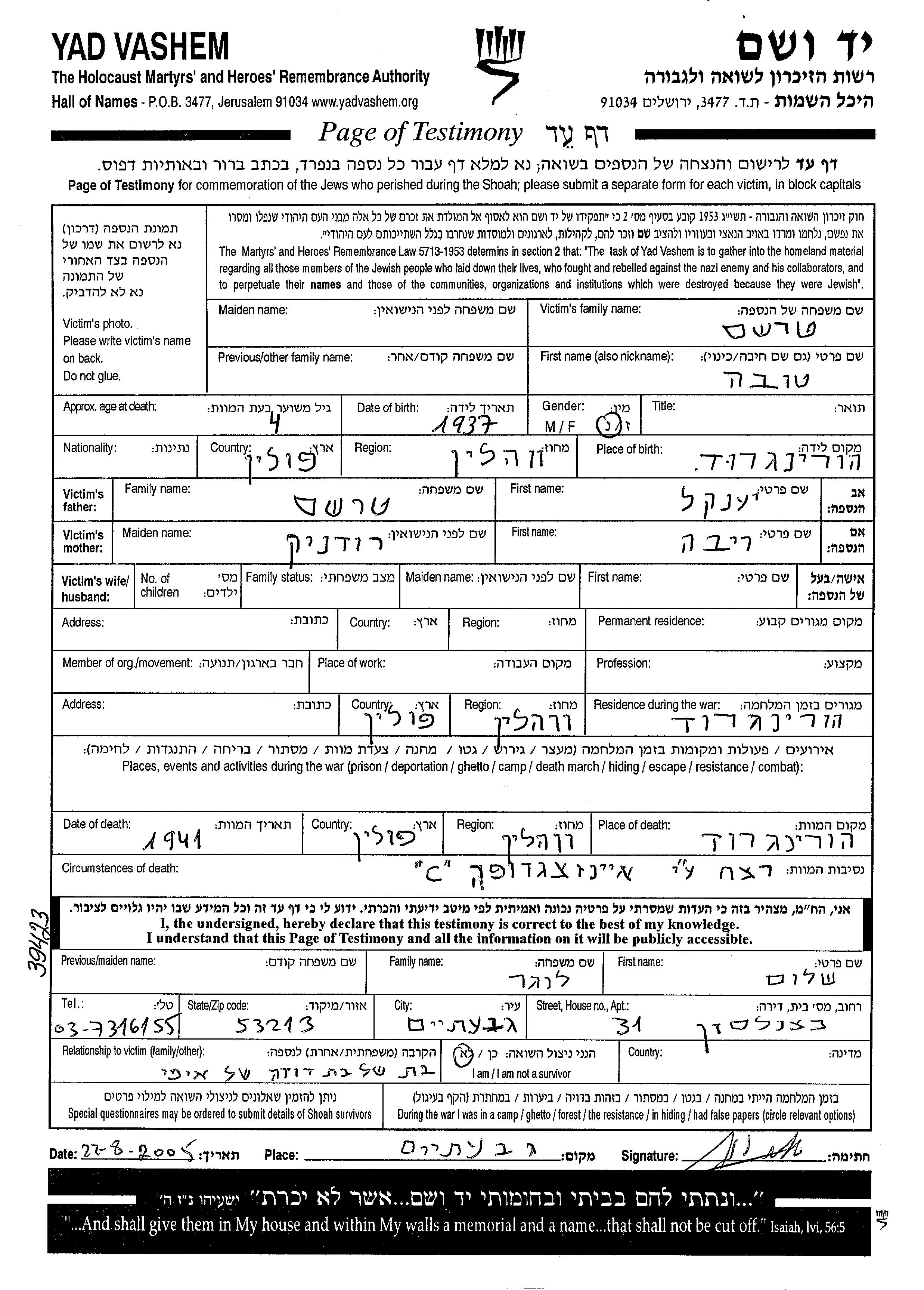 Tova wurde in der Schoah ermordet. Todesort: Horingrod Krupa, Polen im Jahr 1941.