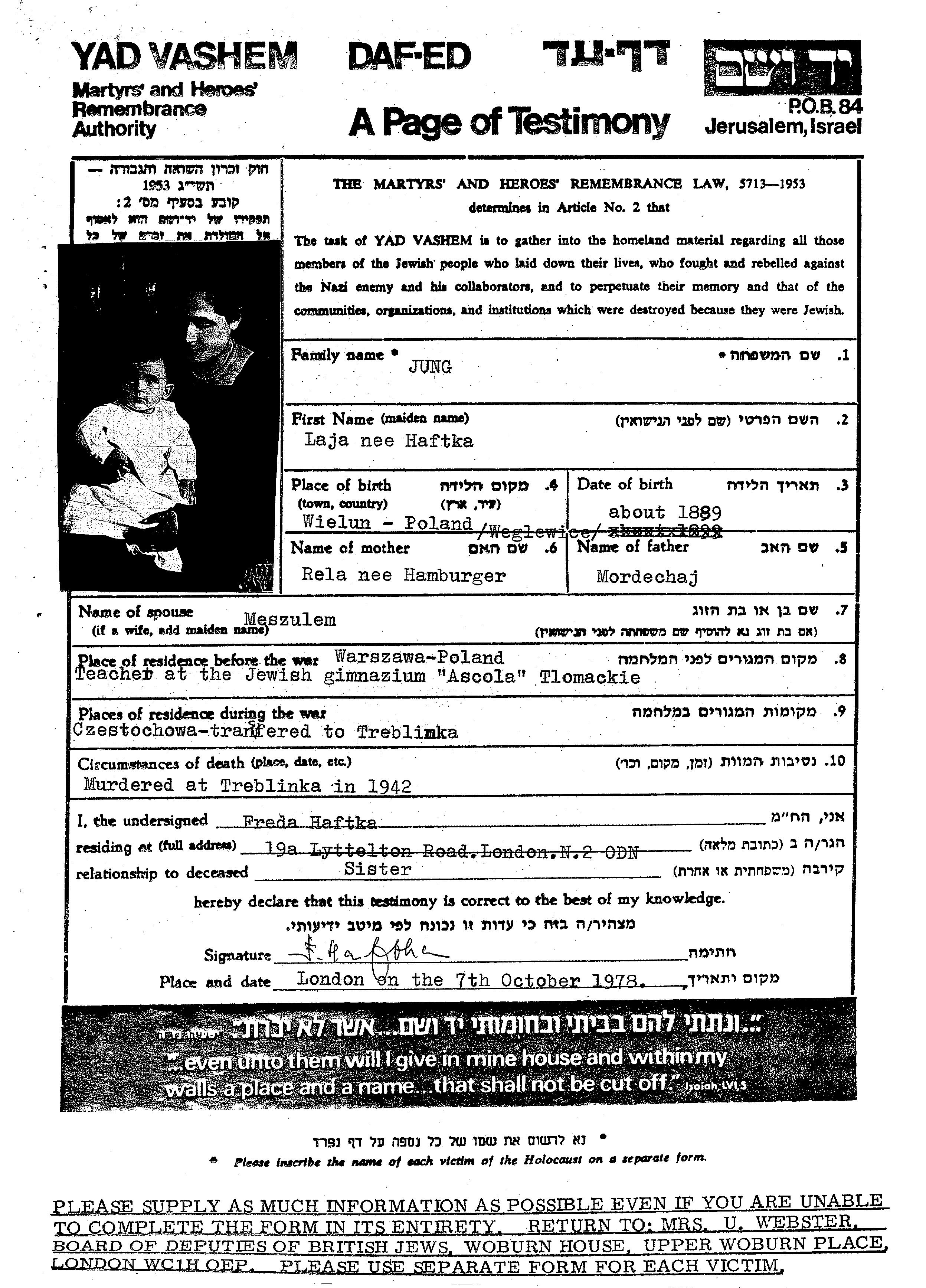 Laja Jung, geb. Haftka wurde im Jahr 1889 in Wielun, Polen geboren. Sie war Lehrer/in. Vor dem Zweiten Weltkrieg lebte sie in Warszawa, Polen.