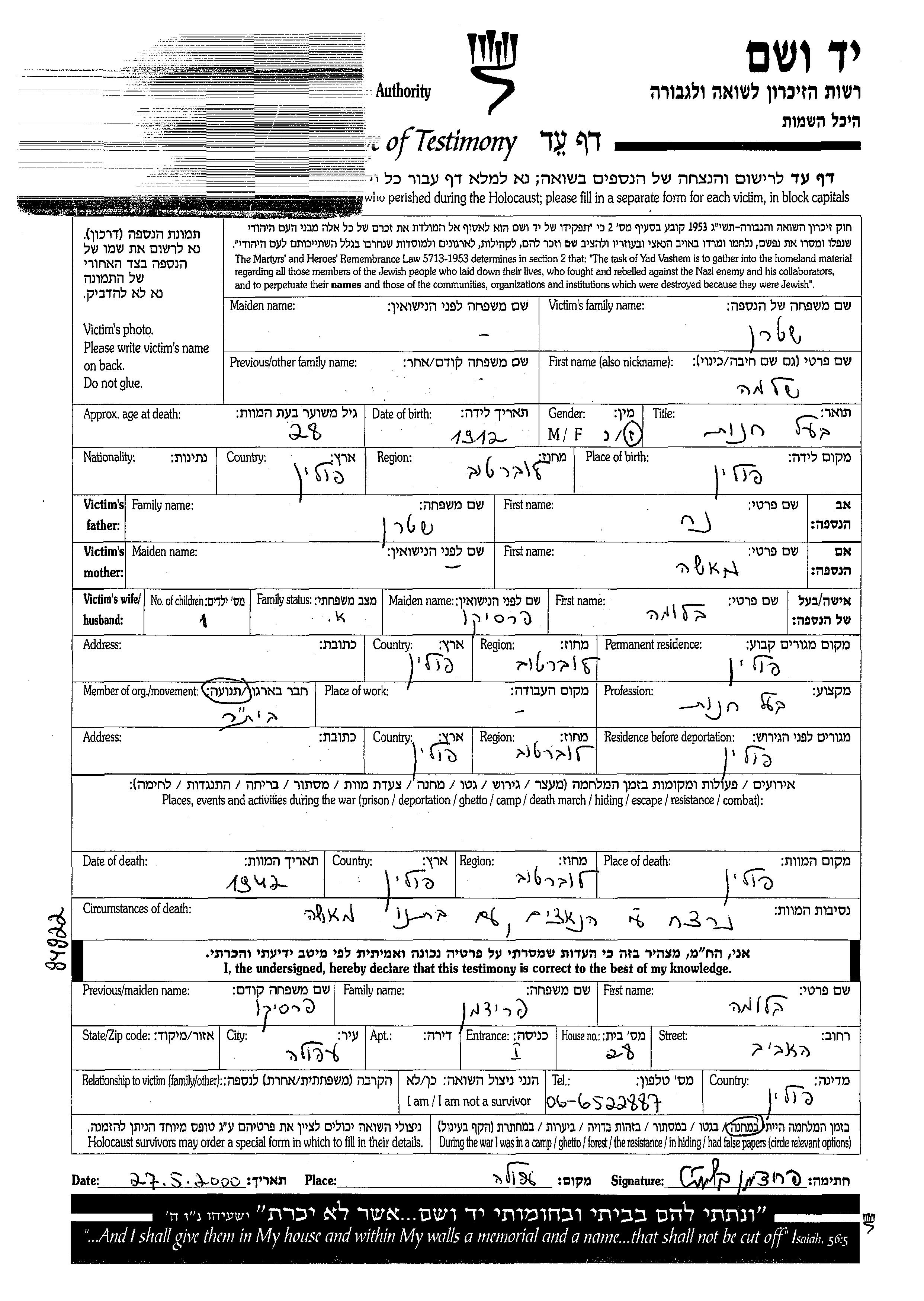 Masha wurde in der Schoah ermordet. Todesort: unbekannter Ort.