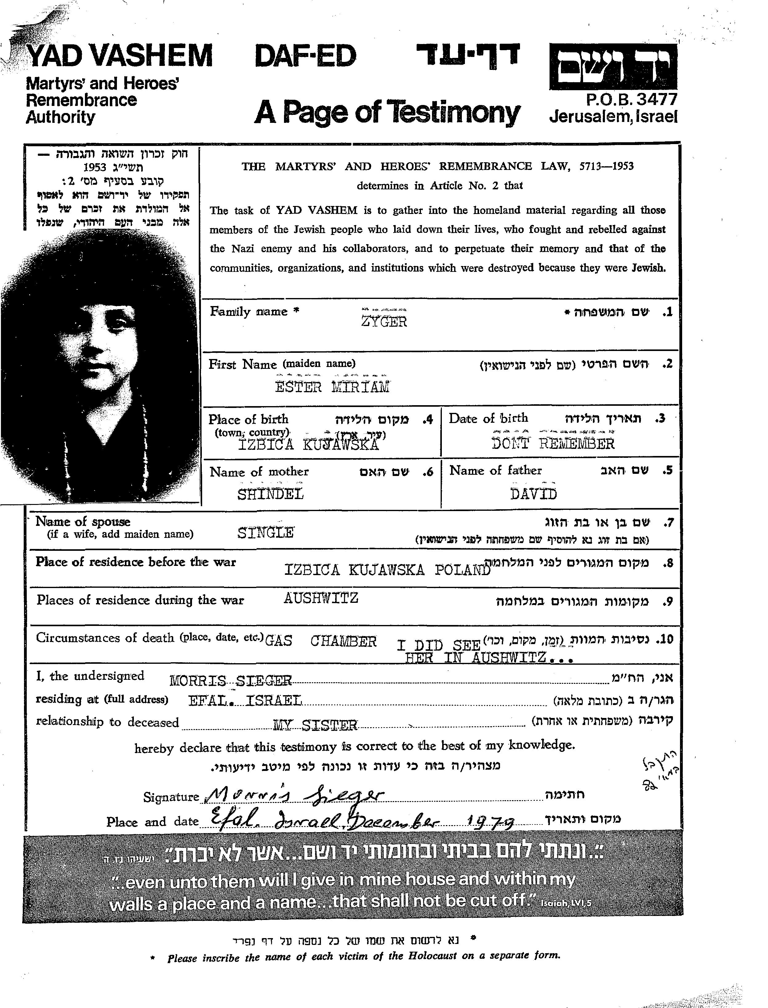 Ester Miriam Zyger wurde in Izbica Kujawska, Polen geboren. Vor dem Zweiten Weltkrieg lebte sie in Izbica Kujawska, Polen.