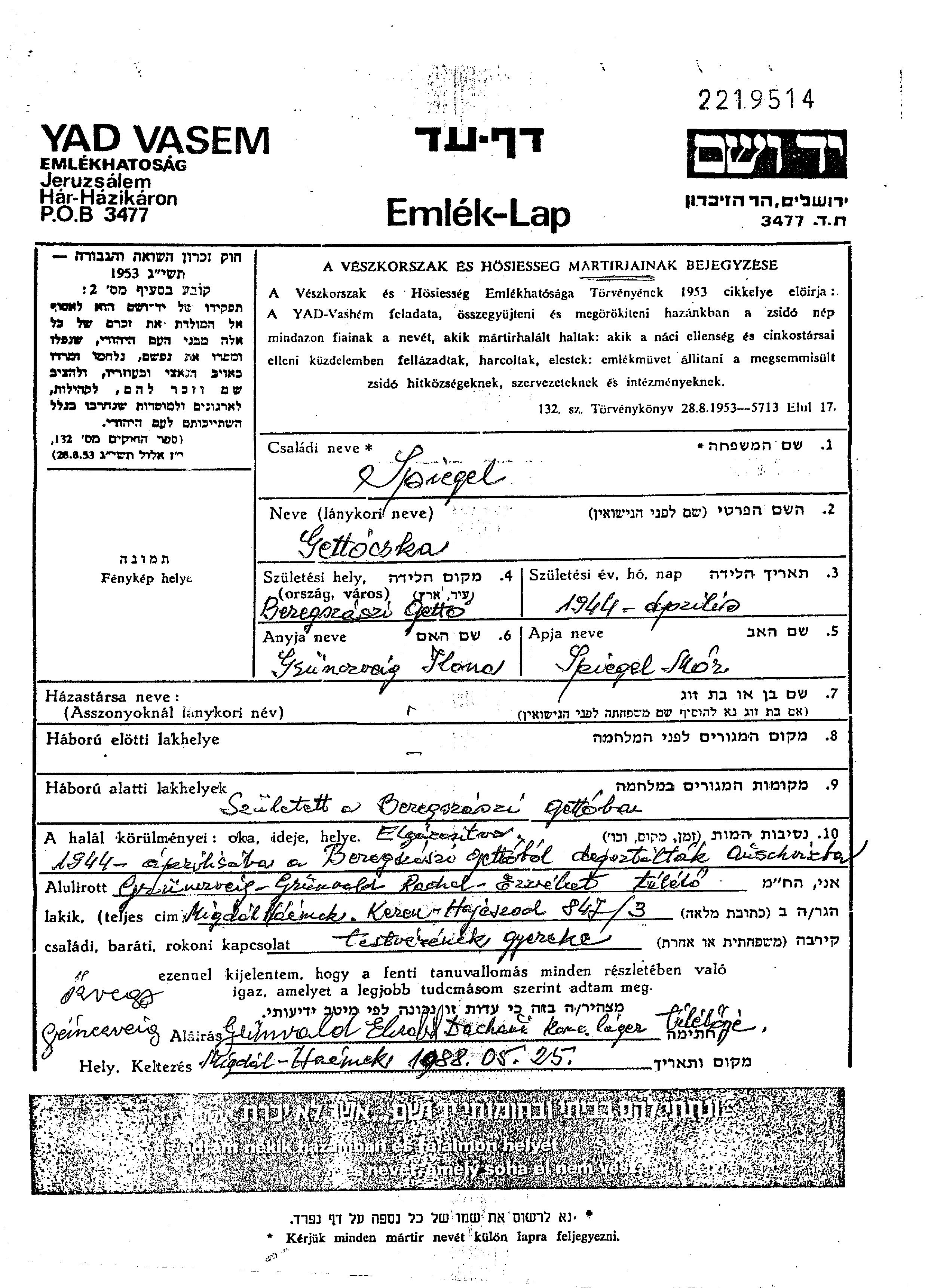 Geta Spiegel wurde im Jahr 1944 in Beregszasz, Tschechoslowakei geboren. Sie war die Tochter von Mor und Ilona, geb. Gruenczveig. Sie war Kind. Während des Krieges war sie in Beregszasz, Tschechoslowakei.