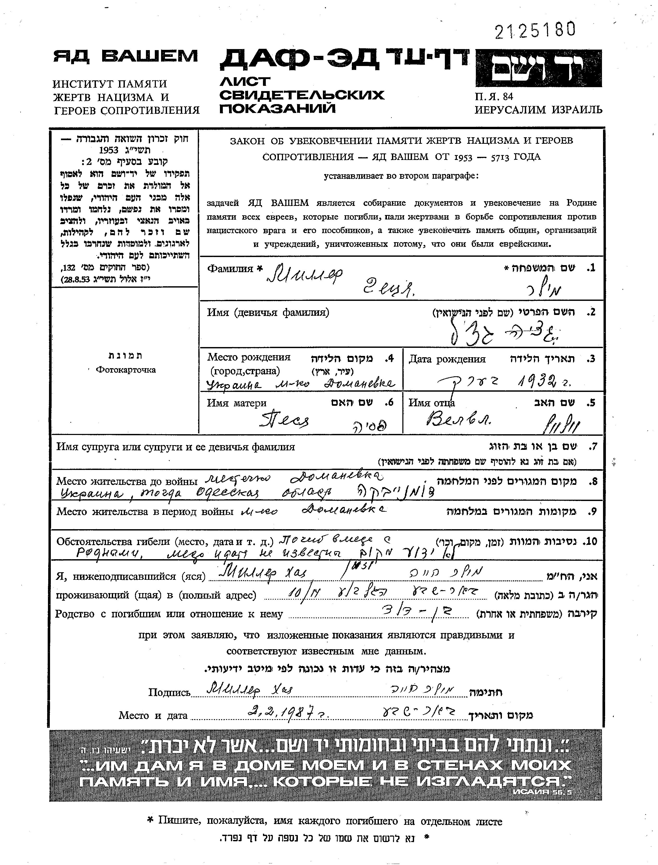 Getzl Miller wurde im Jahr 1932 in Domanevka, Ukraine (UdSSR) geboren. Er war der Sohn von Velvl und Pesya. Er war Kind. Vor dem Zweiten Weltkrieg lebte er in Domanevka, Ukraine (UdSSR). Während des Krieges war er in Domanevka, Ukraine (UdSSR).