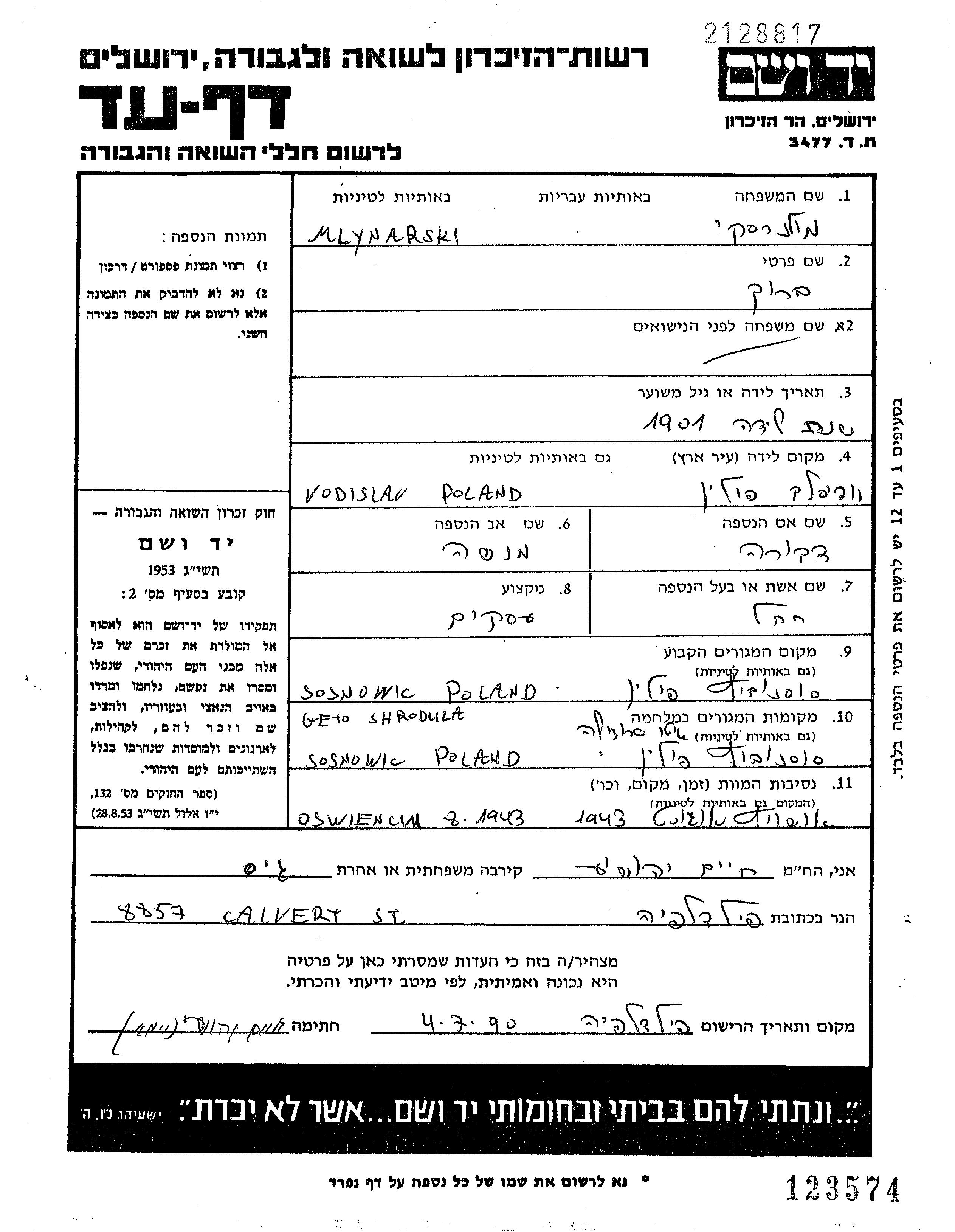 Barukh Mlynarski Milinarschi wurde im Jahr 1901 in Wodzislaw, Polen geboren. Er war der Sohn von Menashe und Dvora. Er war Geschäftsmann und mit Rakhel Verheiratet. Vor dem Zweiten Weltkrieg lebte er in Sosnowiec, Polen. Während des Krieges war er in Srodula, Polen.