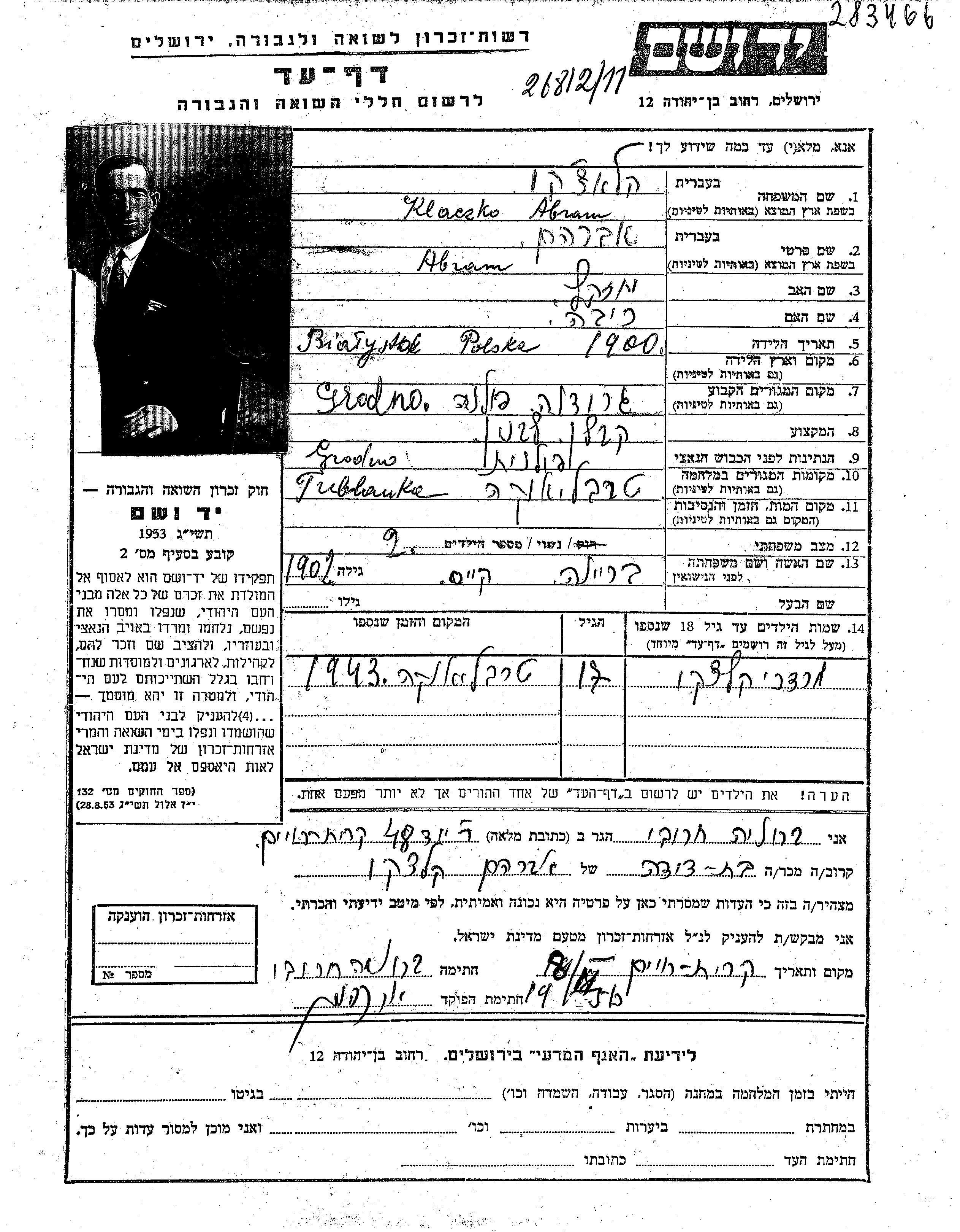 Mordekhai Kaczko Klachko. Vor dem Zweiten Weltkrieg lebte er in Grodno, Polen.