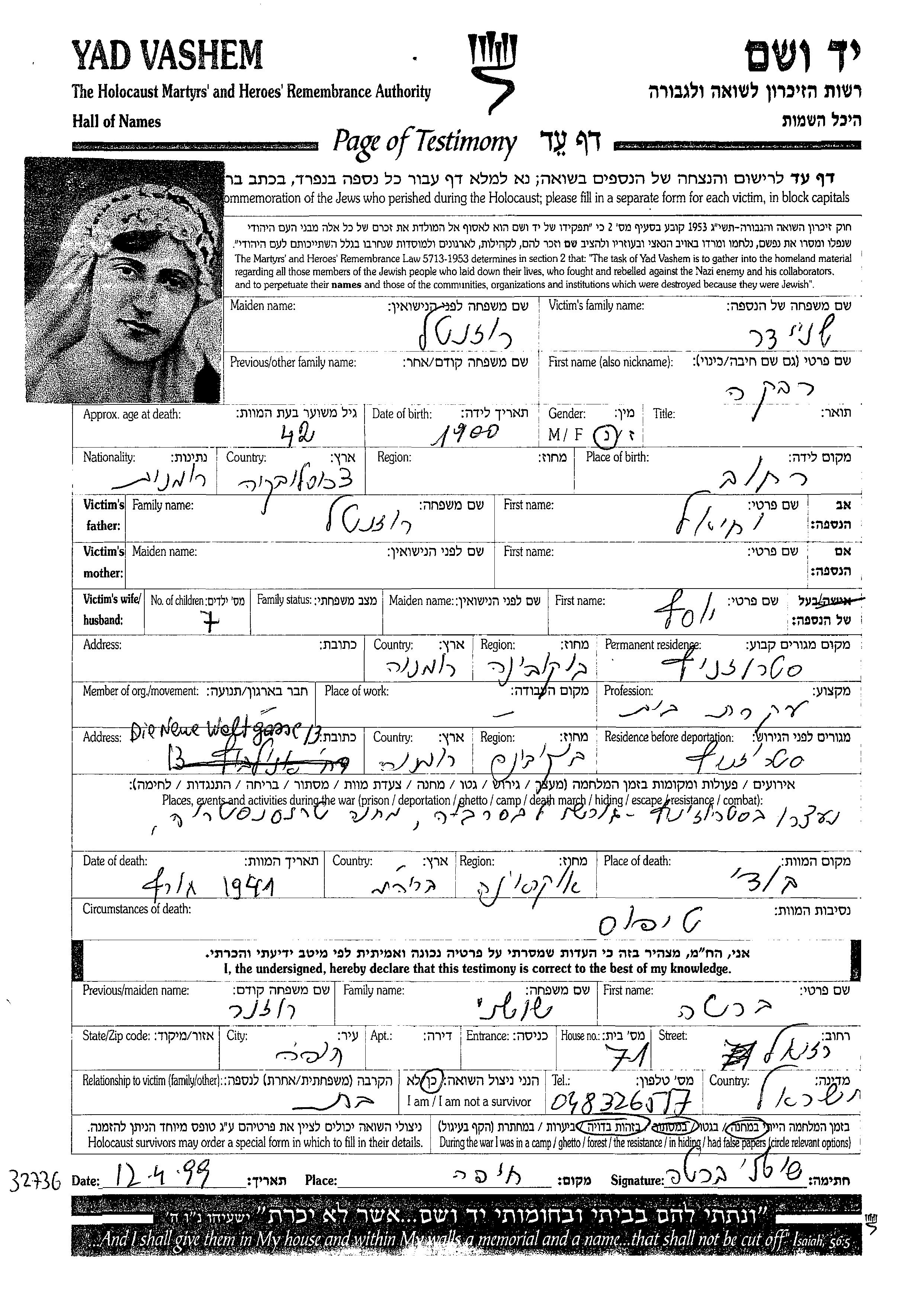 Rivka Shneider, geb. Rozental wurde im Jahr 1900 in Tschechoslowakei geboren. Sie war Hausfrau. Vor dem Zweiten Weltkrieg lebte sie in Rumänien.