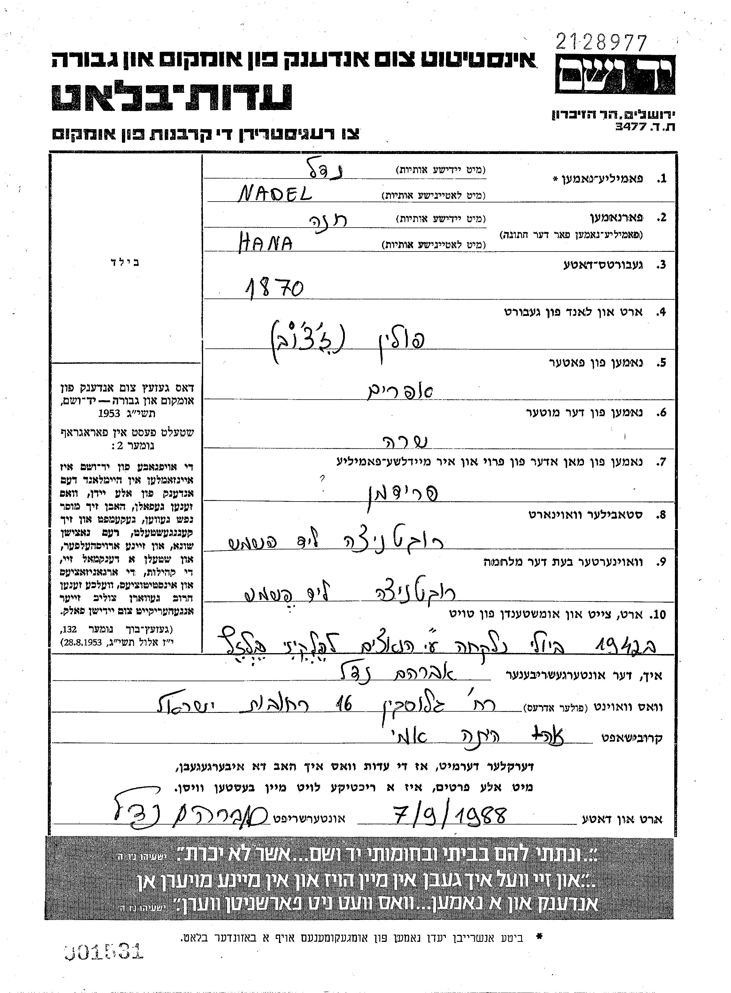 Hana Nadel, geb. Fridman wurde im Jahr 1870 in Rzeszow, Polen geboren. Sie war die Tochter von Efraim und Sara. Sie war mit Kalman Verheiratet. Vor dem Zweiten Weltkrieg lebte sie in Rokietnica, Polen. Während des Krieges war sie in Rokietnica, Polen.