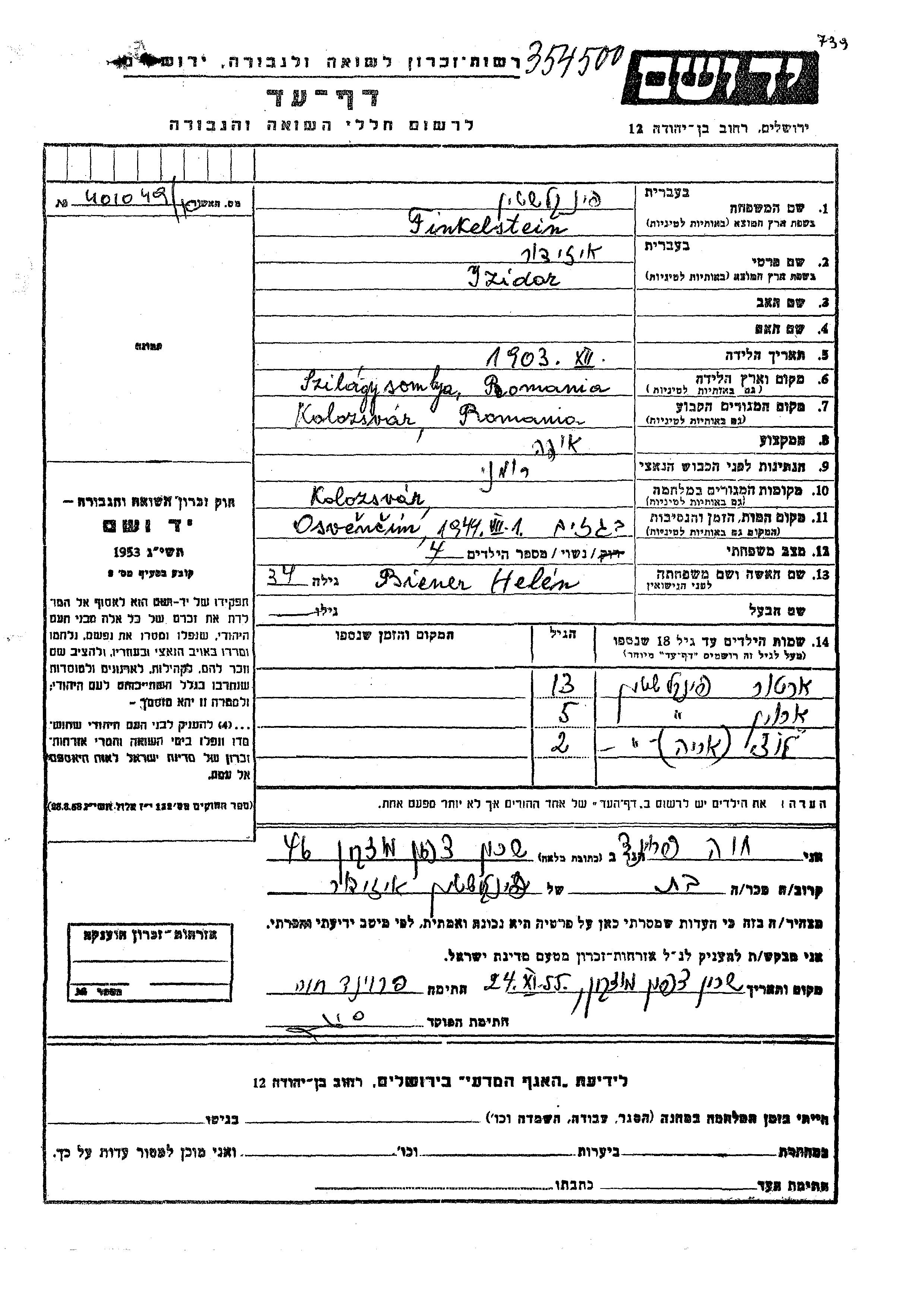 Finkelstein Luci Arie Kolozsvar, Rumänien Gedenkblatt