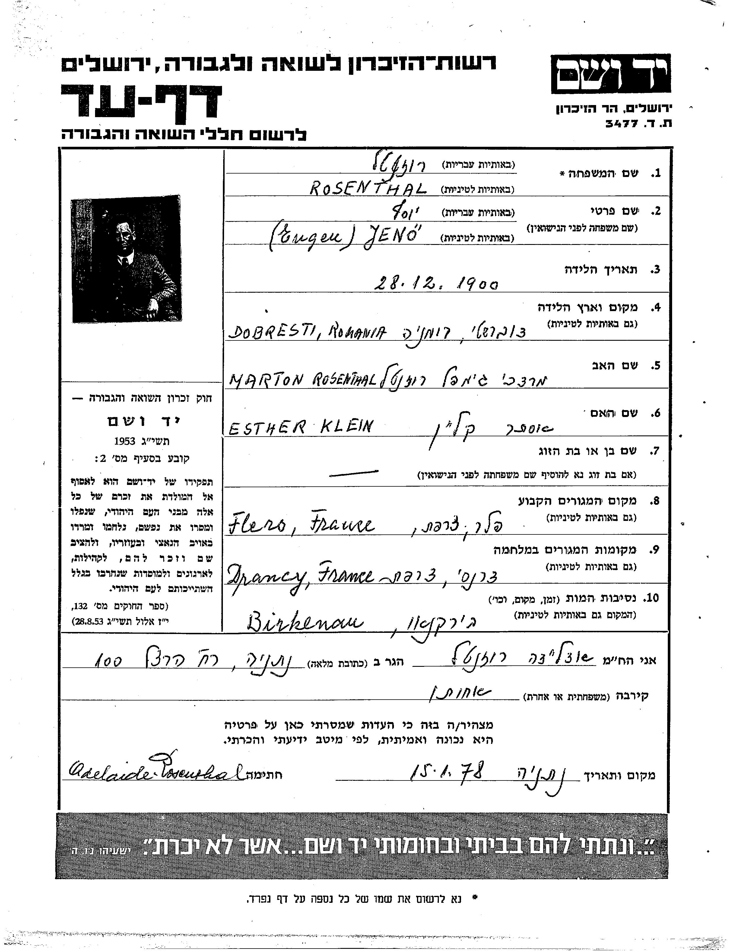 Yeno Eugen Yosef Rosenthal wurde im Jahr 1900 in Dobresti, Rumänien geboren. Vor dem Zweiten Weltkrieg lebte er in Flers, Frankreich.