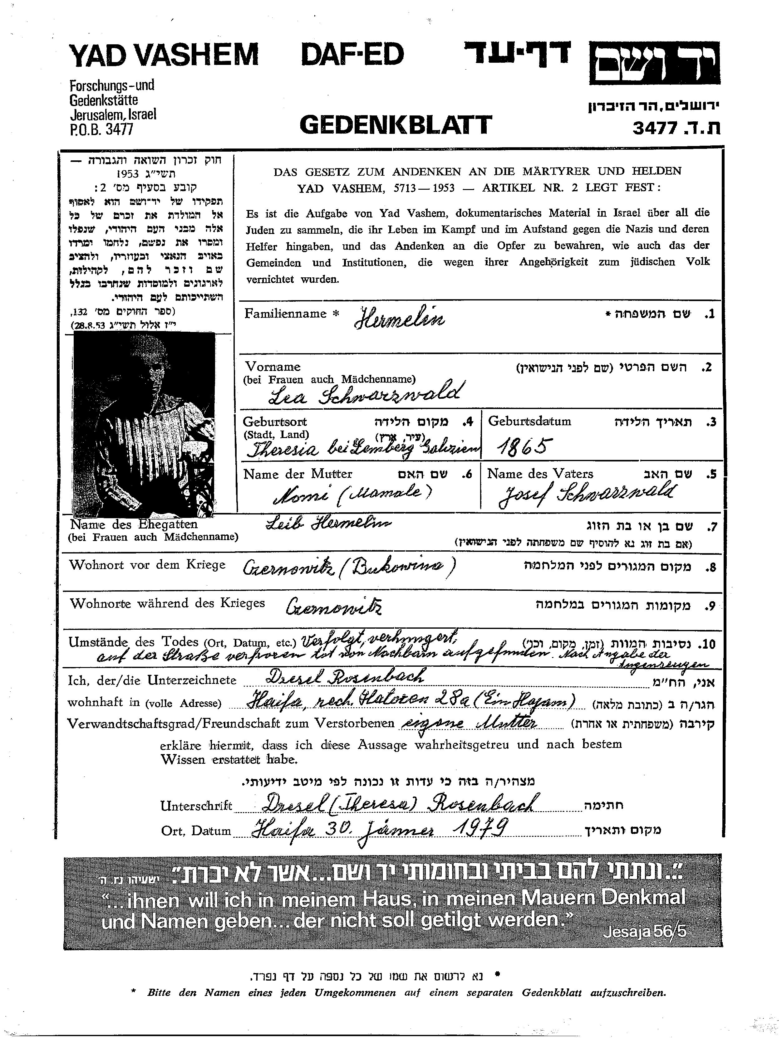 Lea Hermelin, geb. Schwarzwald wurde im Jahr 1865 in Terezja, Polen geboren. Vor dem Zweiten Weltkrieg lebte sie in Cernauti, Rumänien.