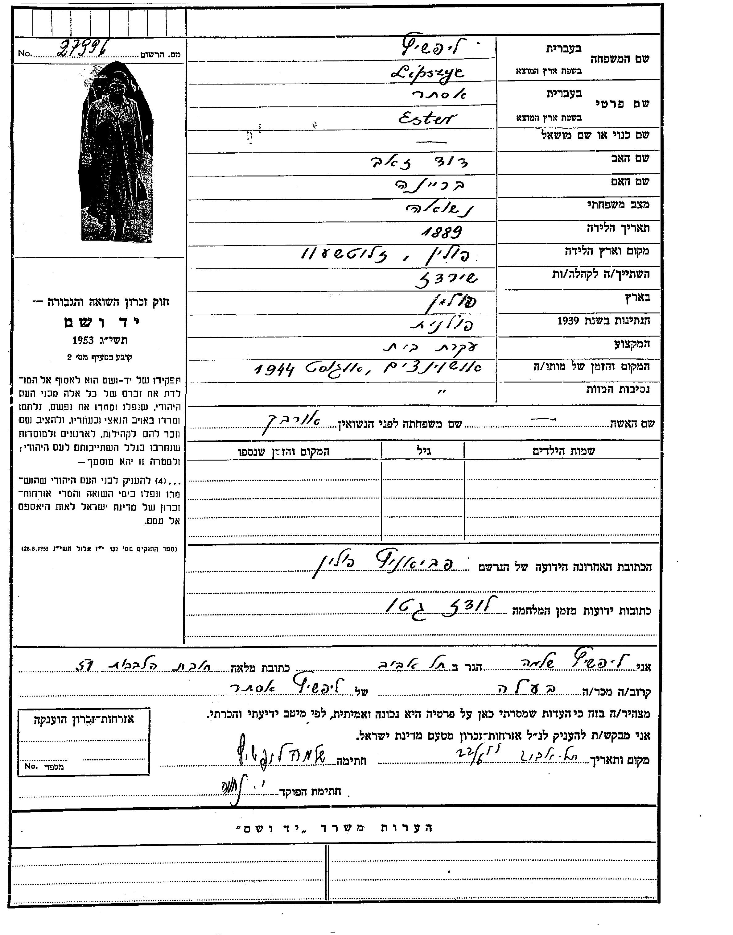 Ester Lipszyc, geb. Orbakh wurde im Jahr 1889 in Zloczew, Polen geboren. Sie war Hausfrau. Vor dem Zweiten Weltkrieg lebte sie in Pabjanice, Polen.