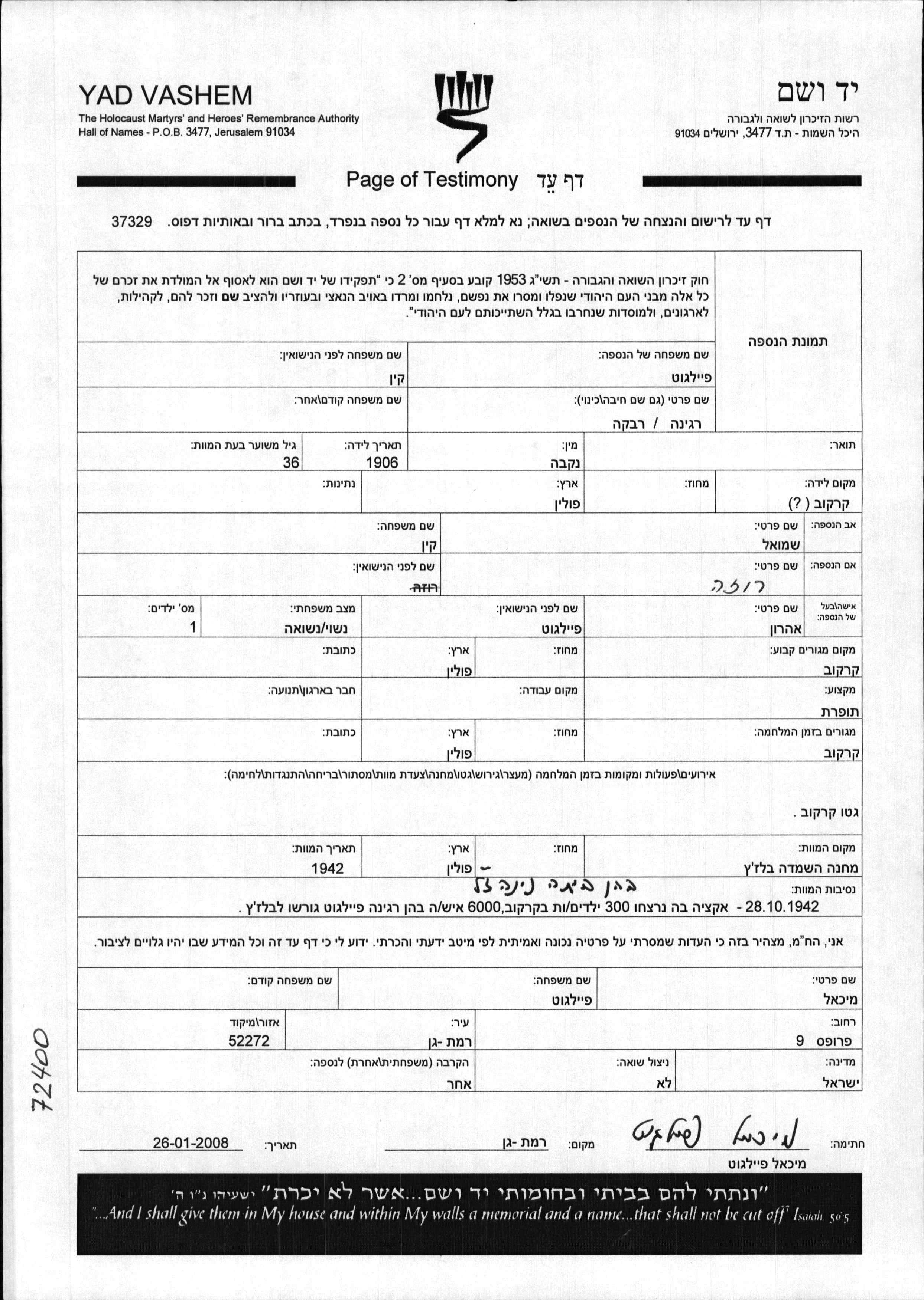 Regina Rivka Feilgut, geb. Kin wurde im Jahr 1906 in Krakow, Polen geboren. Sie war Modistin. Vor dem Zweiten Weltkrieg lebte sie in Krakow, Polen.