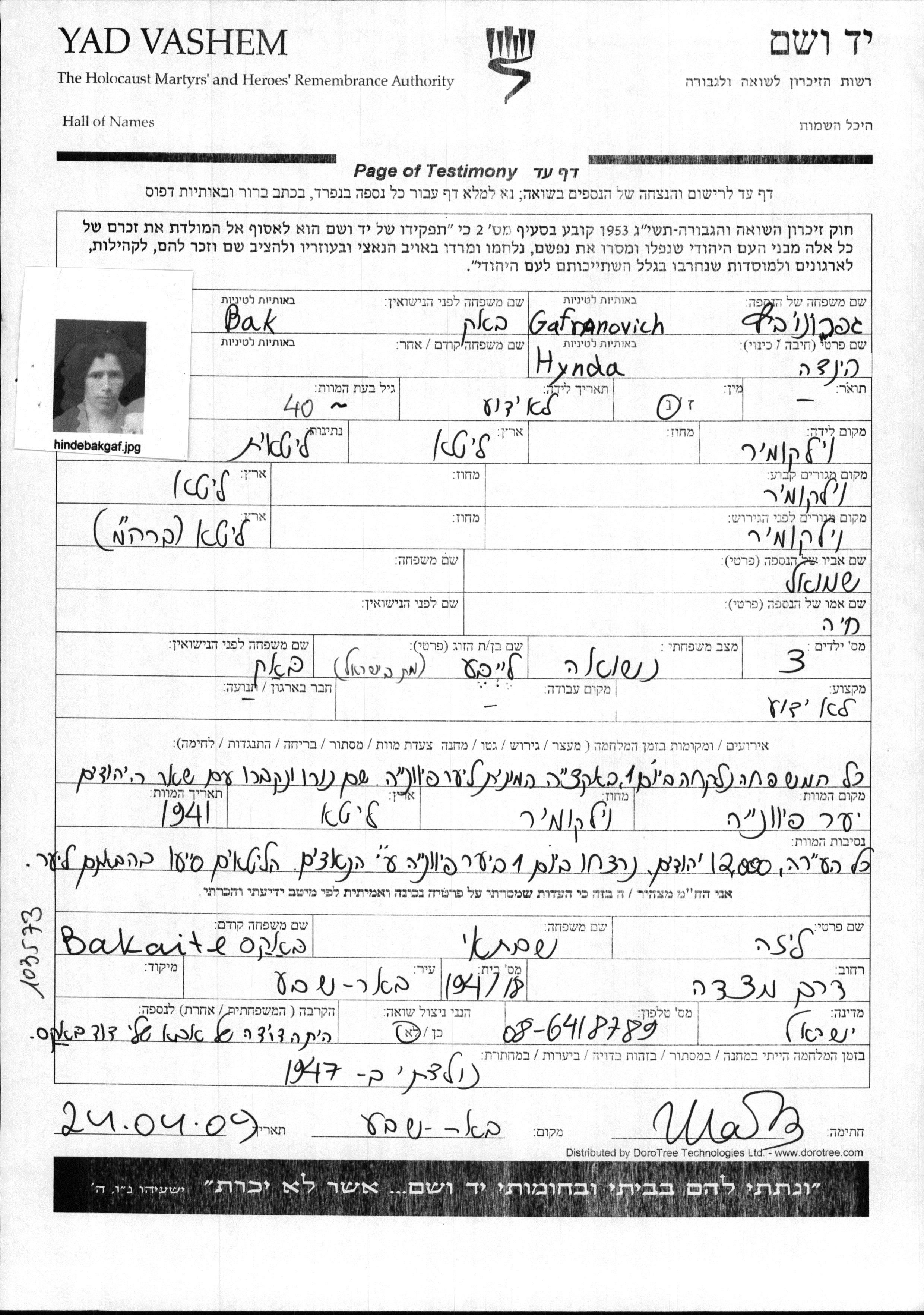 Hynda Gafranovich, geb. Bak wurde im Jahr 1901 in Ukmerge, Litauen geboren. Vor dem Zweiten Weltkrieg lebte sie in Ukmerge, Litauen.