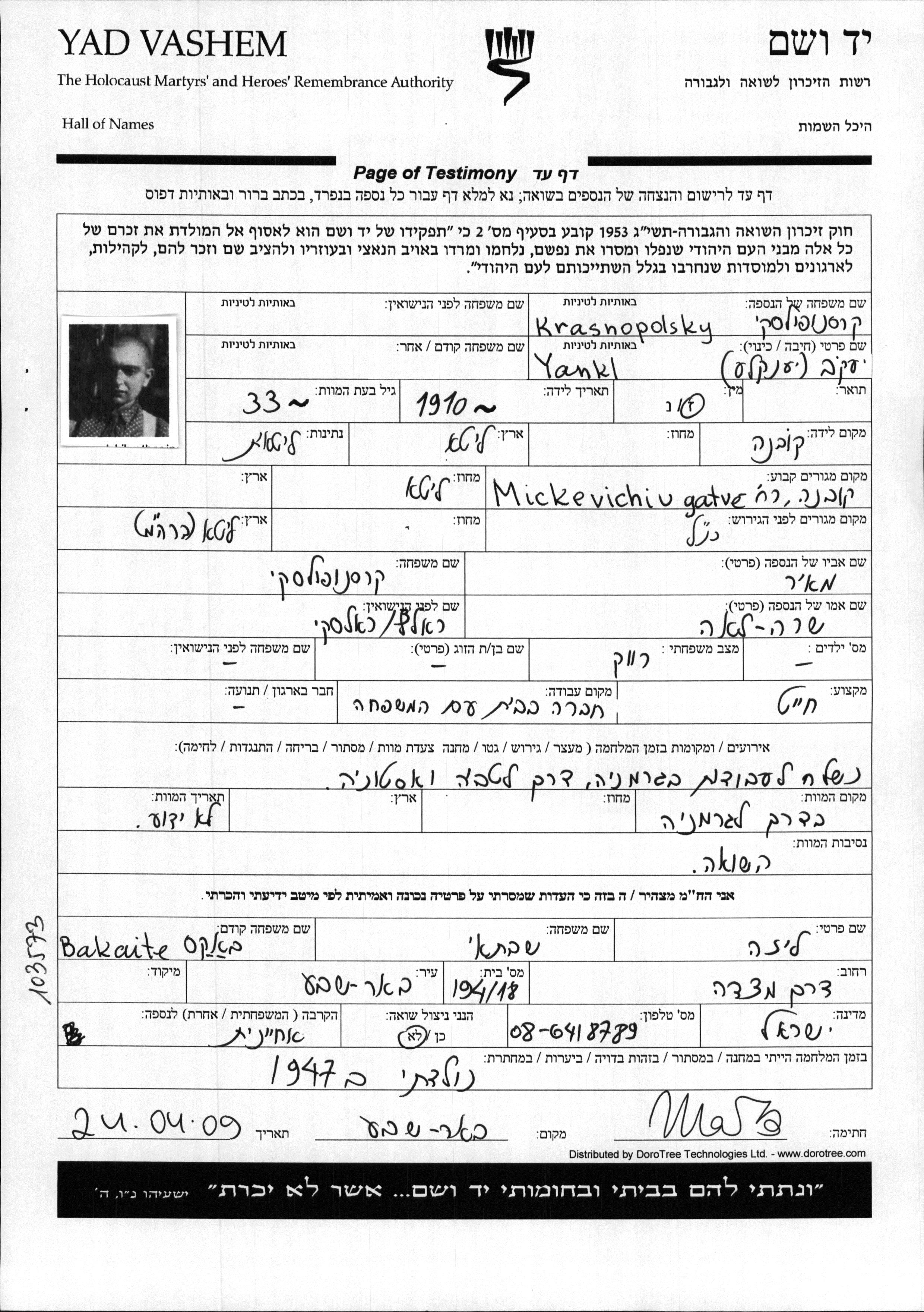 Yankl Krasnopolsky wurde im Jahr 1910 in Kaunas, Litauen geboren. Er war Schneider. Vor dem Zweiten Weltkrieg lebte er in Kaunas, Litauen.