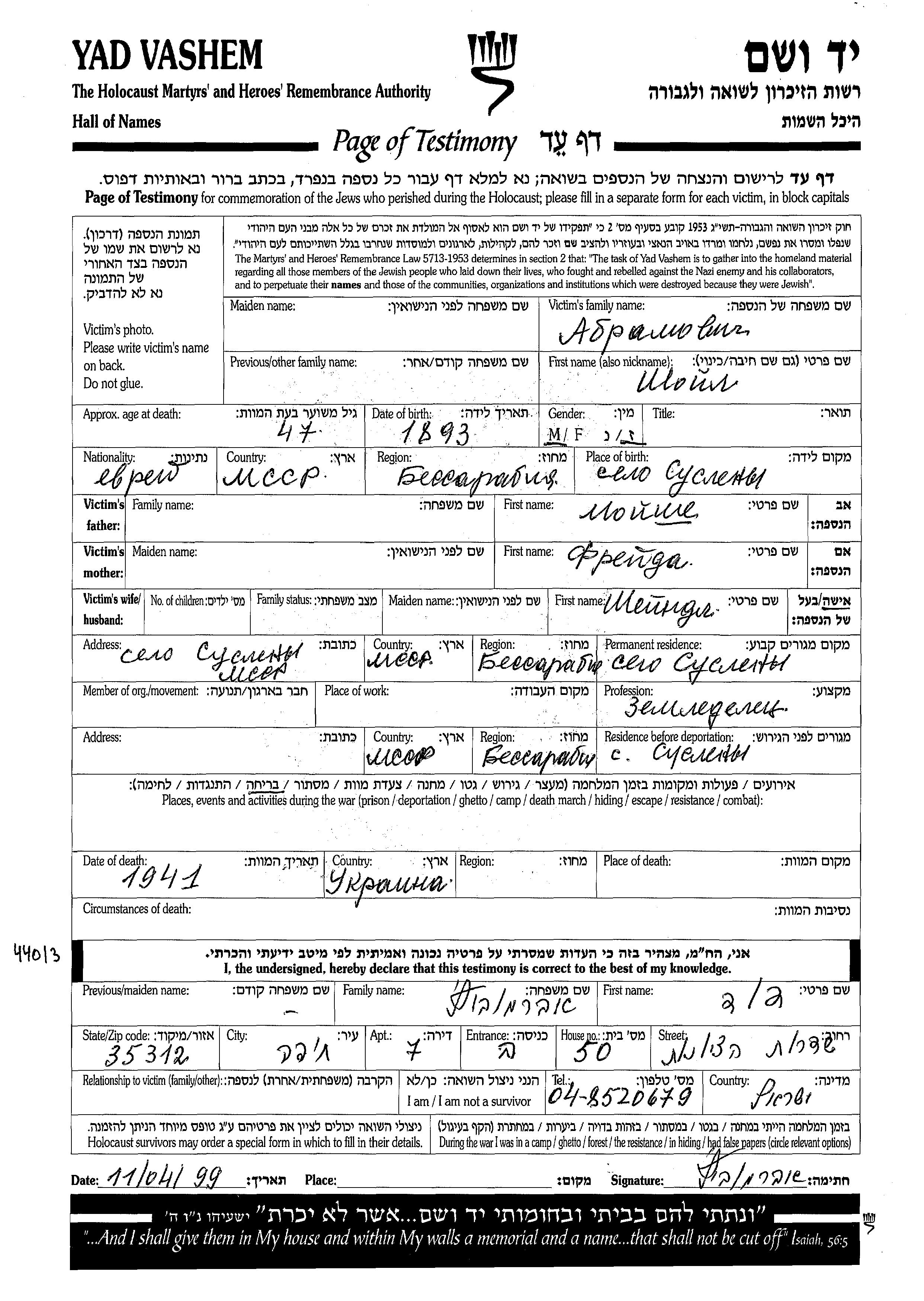 Abramovich | Shaul | 1893 | Susleny, Rumänien | Gedenkblatt |