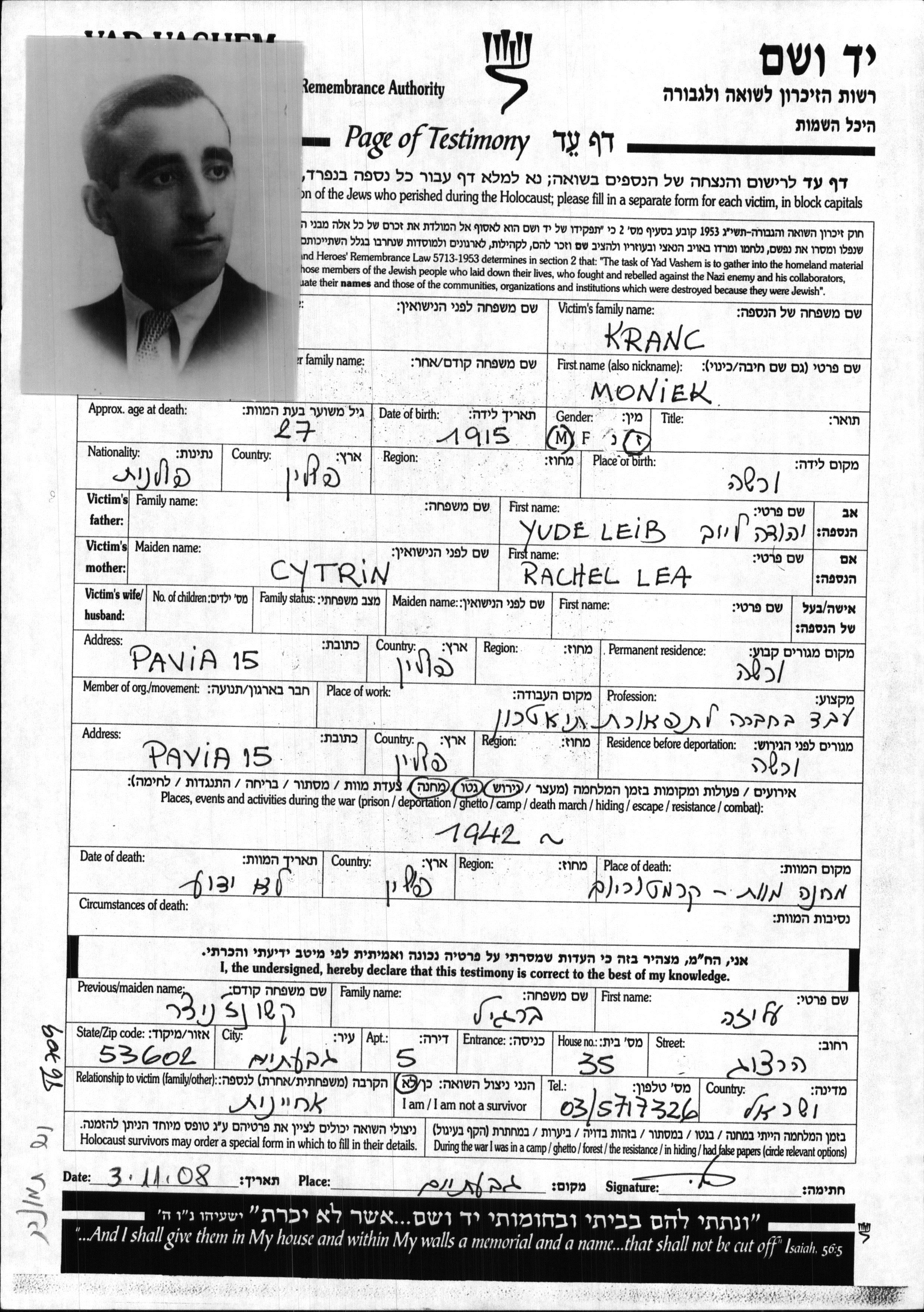 Moniek Kranc wurde im Jahr 1915 in Warszawa, Polen geboren. Er war תפאורן. Vor dem Zweiten Weltkrieg lebte er in Warszawa, Polen.