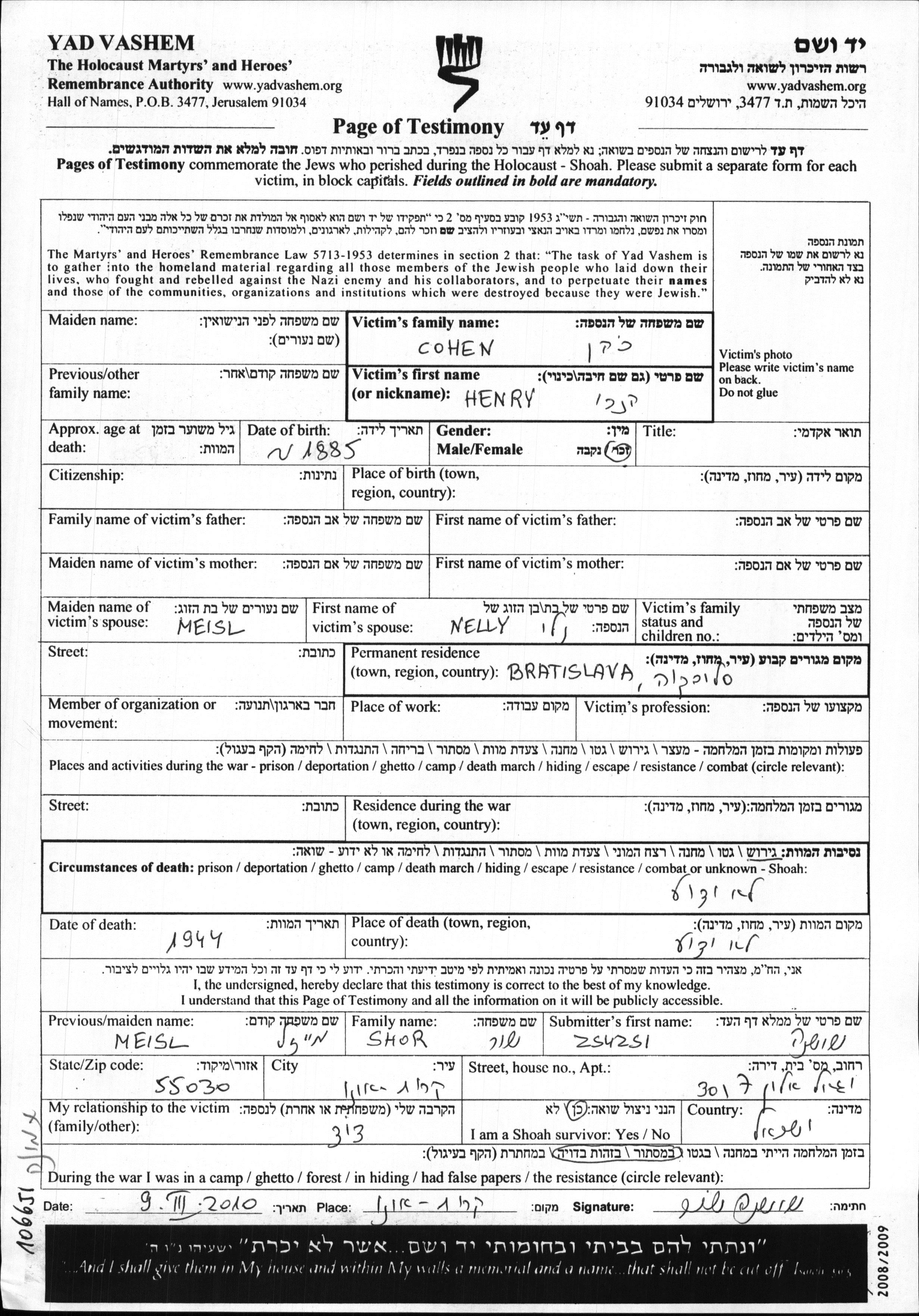 Henry Cohen wurde im Jahr 1885 geboren. Vor dem Zweiten Weltkrieg lebte er in Bratislava, Tschechoslowakei.