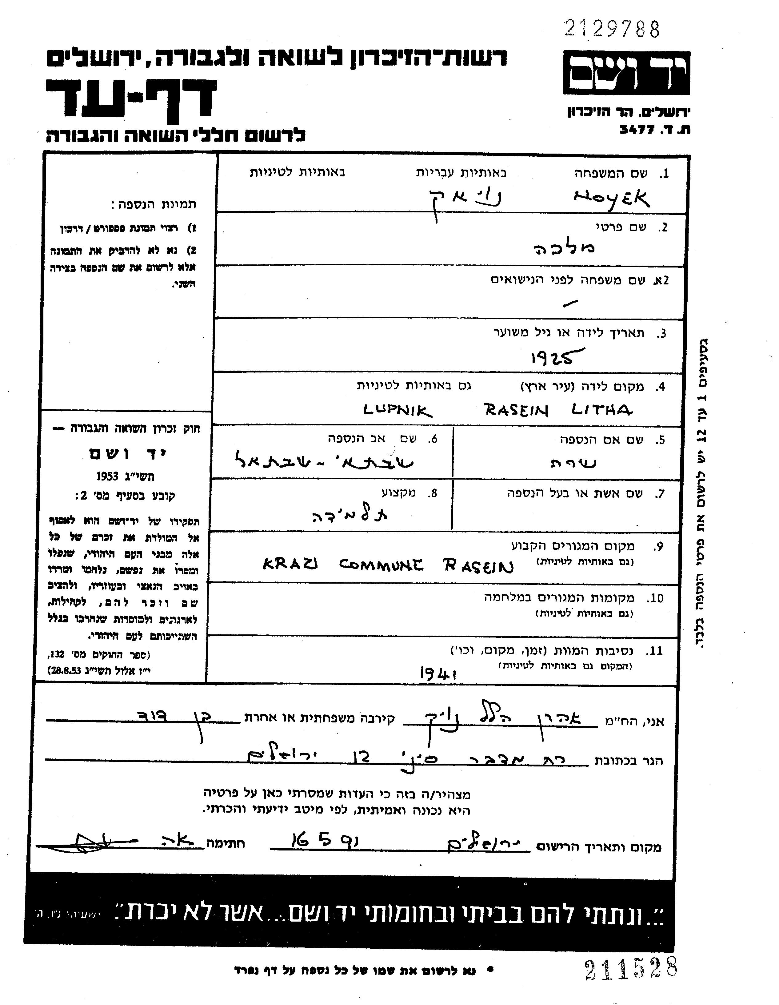 Malka wurde in der Schoah ermordet. Todesort: unbekannt im Jahr 1941.