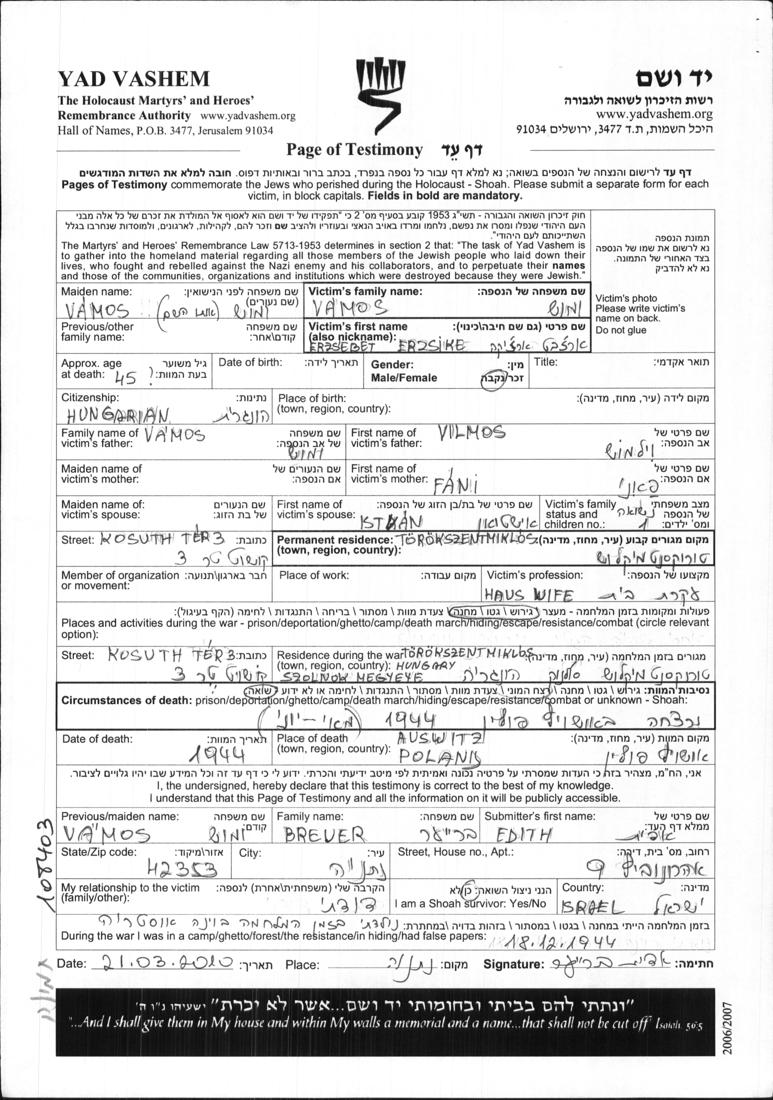 Erzsebet Vamos, geb. Vamos wurde im Jahr 1899 geboren. Sie war Hausfrau. Vor dem Zweiten Weltkrieg lebte sie in Torokszentmiklos, Ungarn.