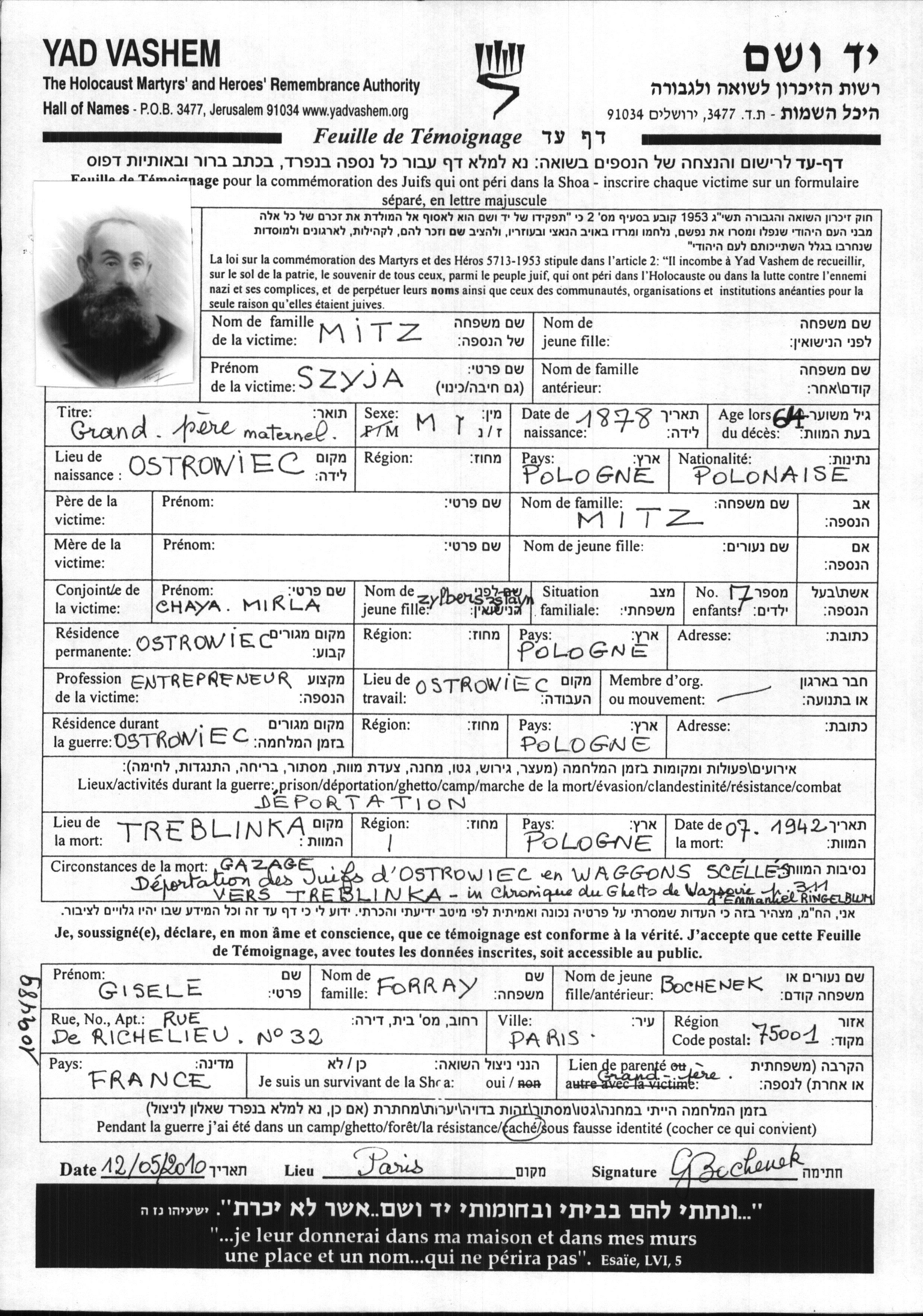 Szyja Mitz wurde im Jahr 1878 in Ostrowiec, Polen geboren. Er war Unternehmer/-in / impresario/-a. Vor dem Zweiten Weltkrieg lebte er in Ostrowiec, Polen.