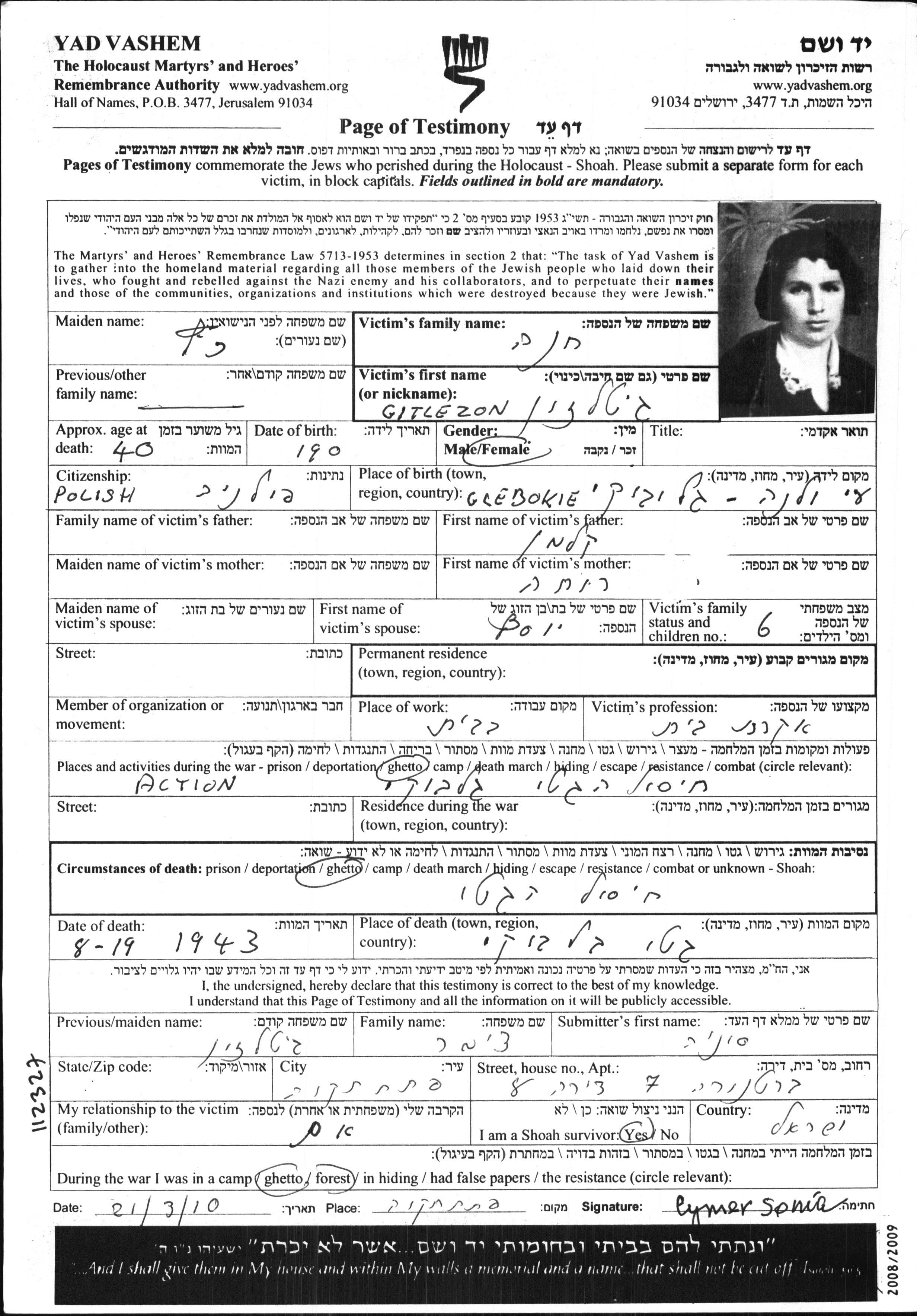 Khana Gitelzon, geb. Katz wurde im Jahr 1900 in Glebokie, Polen geboren. Sie war Hausfrau. Vor dem Zweiten Weltkrieg lebte sie in Glebokie, Polen.