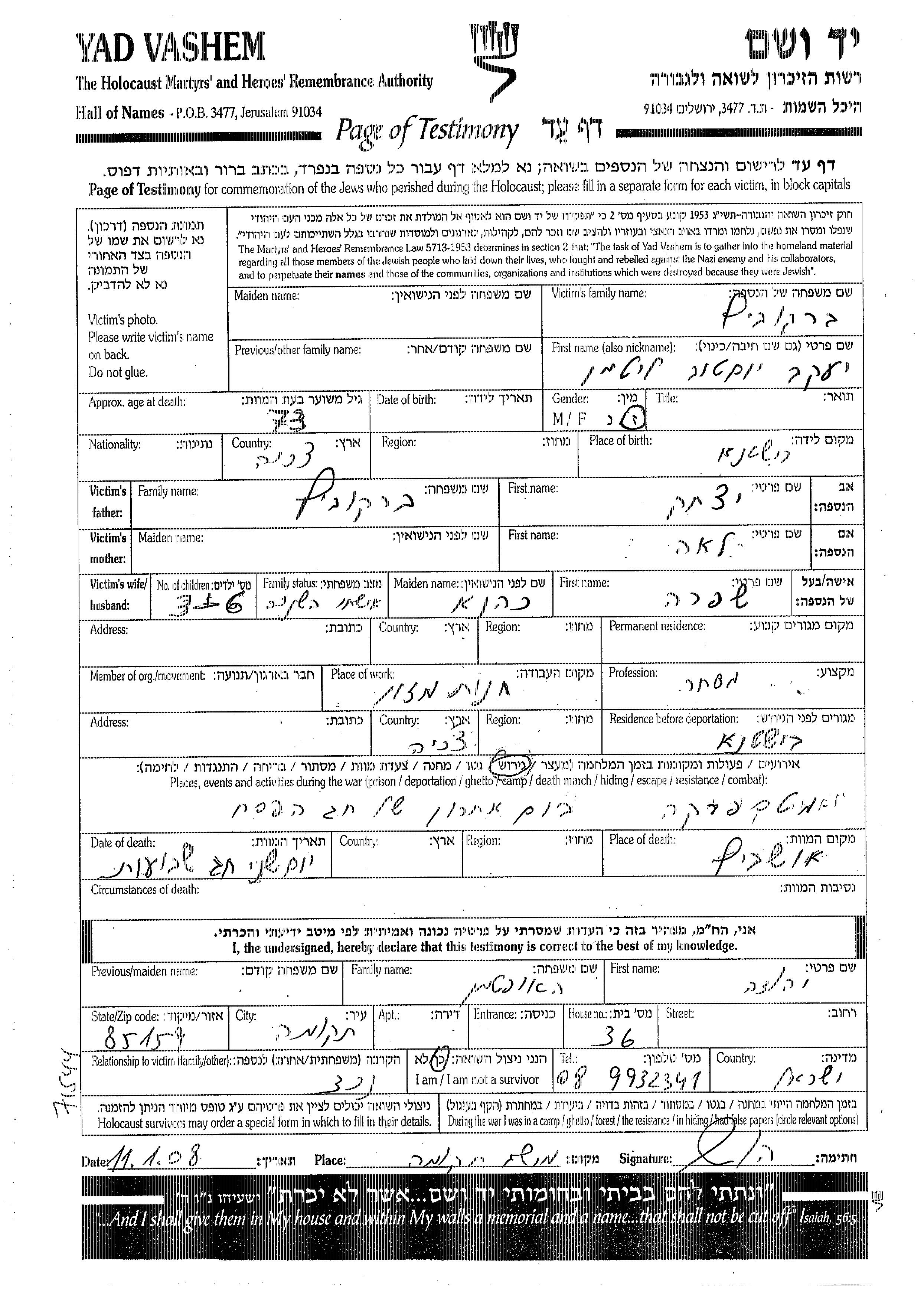 Berkovitz Yaakov Viktor Litman unbekannter Ort, Gedenkblatt