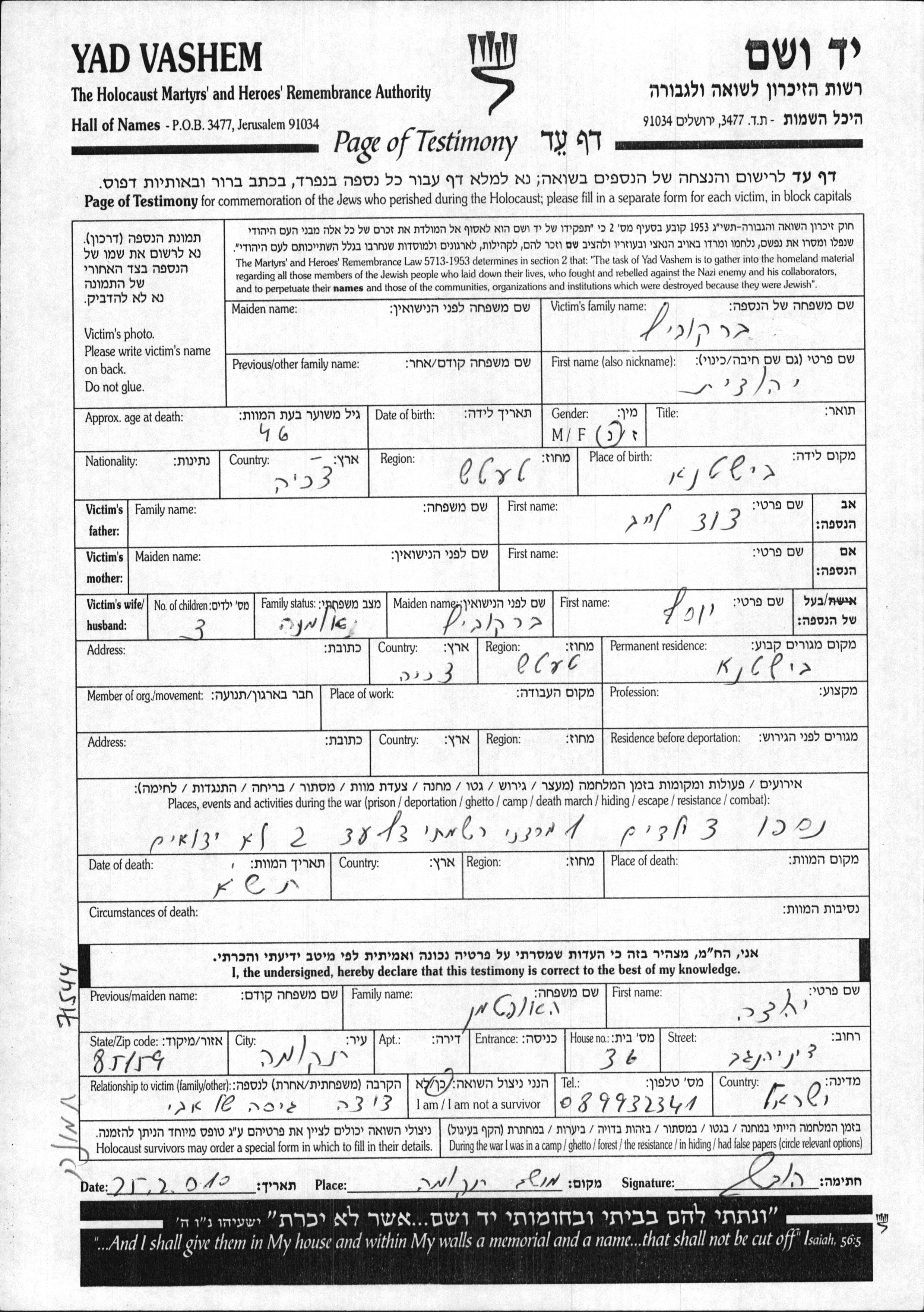 Yehudit Berkovitz wurde im Jahr 1895 in Bustino, Tschechoslowakei geboren. Vor dem Zweiten Weltkrieg lebte sie in Bustino, Tschechoslowakei.
