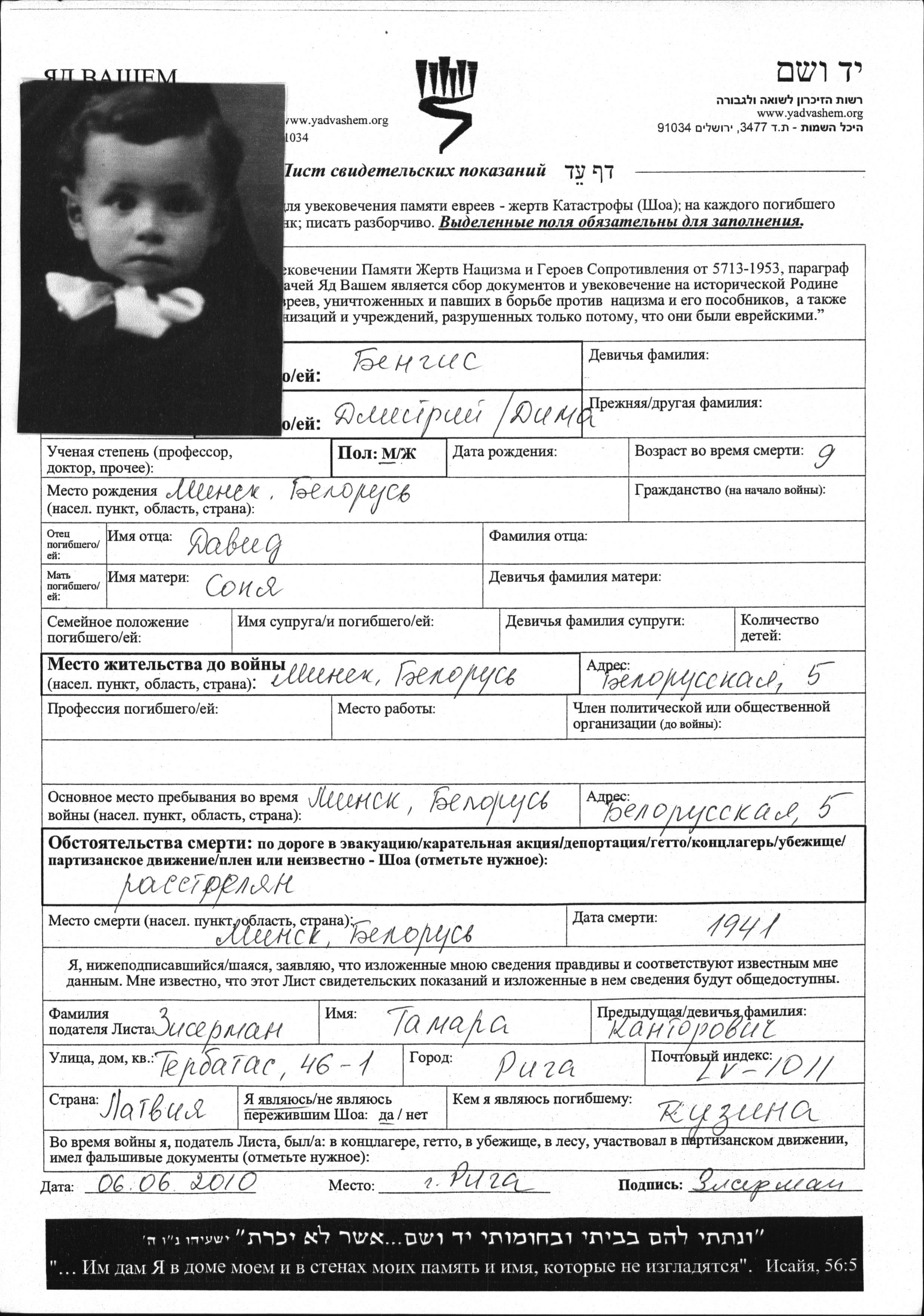 Dmitriy wurde in der Schoah ermordet. Todesort: Minsk, Weißrussland (UdSSR) im Jahr 1941.