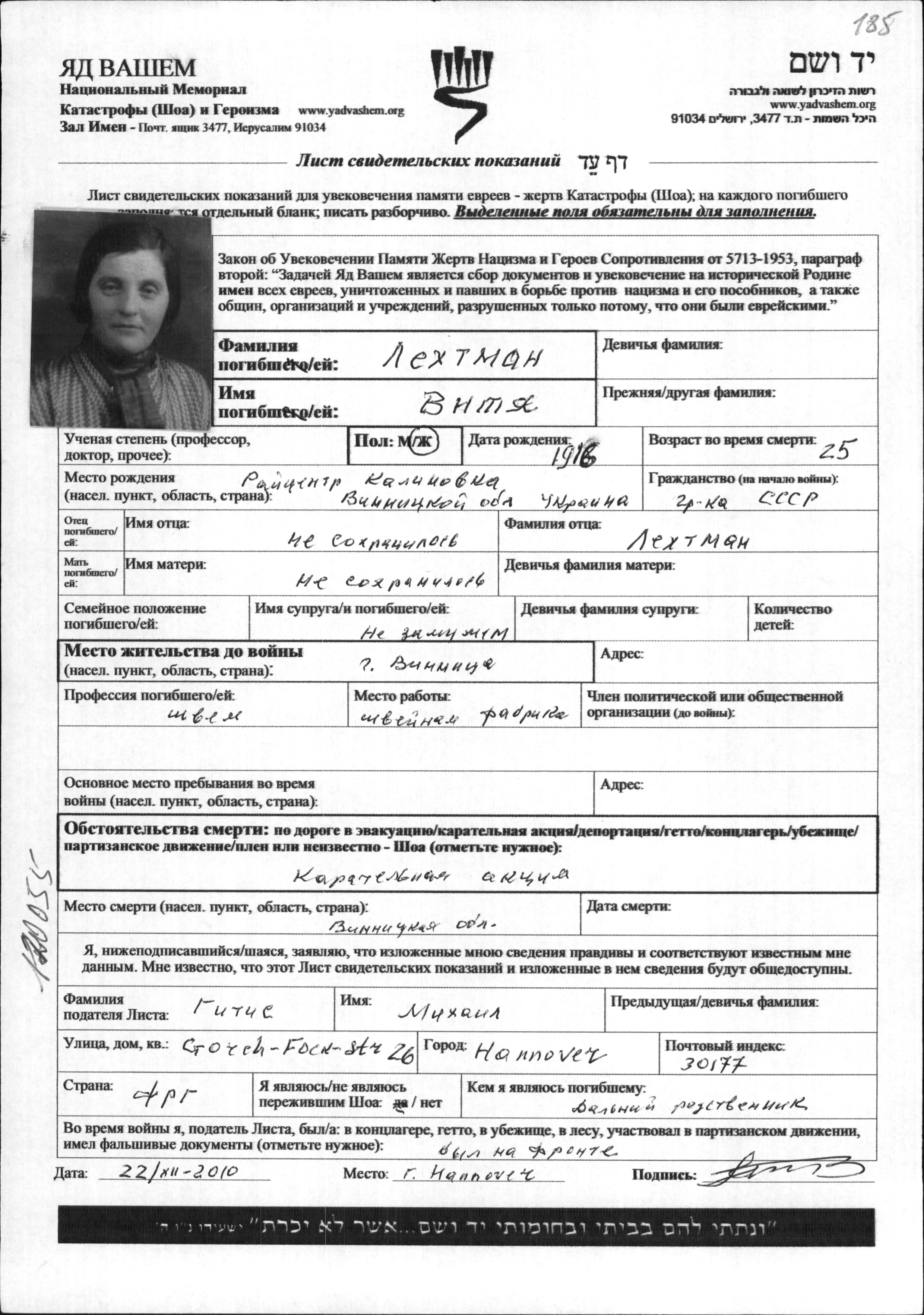 Lekhtman Vitya 1916 Vinnitsa, Ukraine (UdSSR) Gedenkblatt