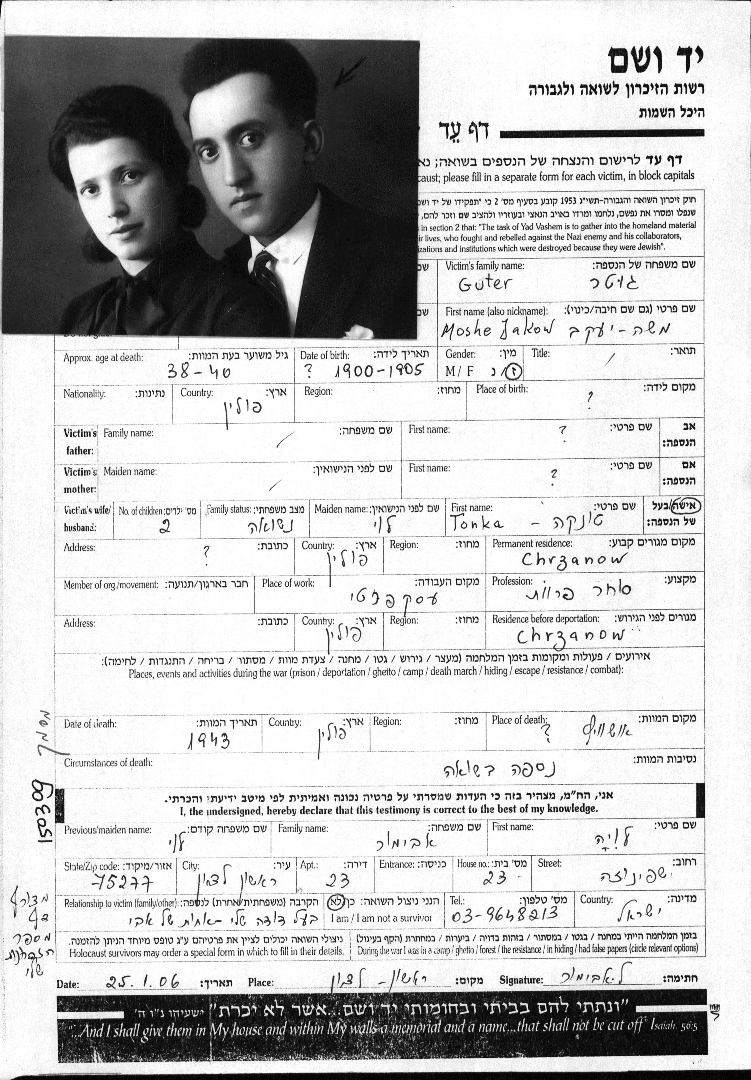 Moshe Jakow Guter wurde im Jahr 1900 geboren. Er war Pelzhändler. Vor dem Zweiten Weltkrieg lebte er in Chrzanow, Polen.