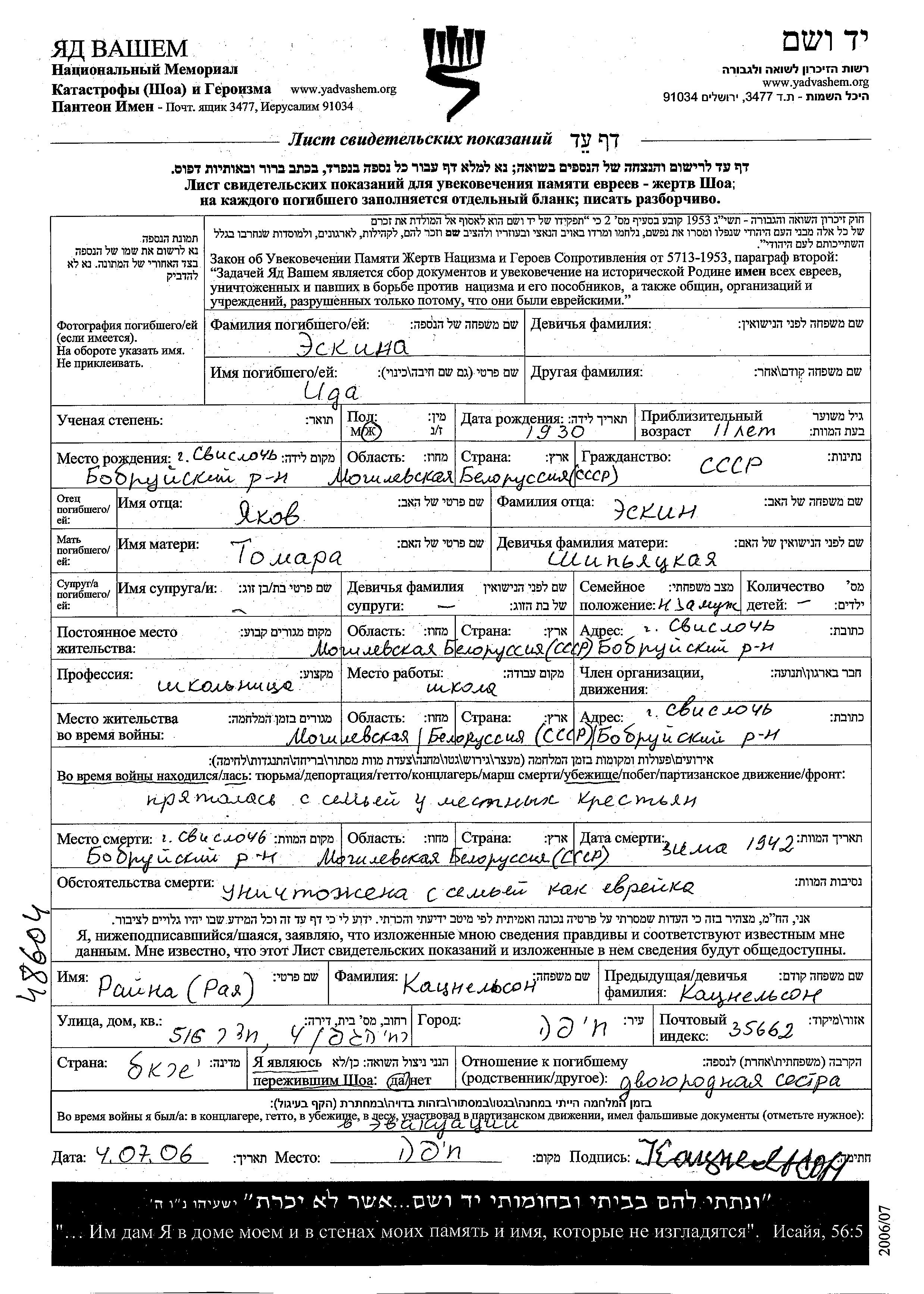 Eskina | Ida | 1930 | Svisloch, Weißrussland (UdSSR) | Gedenkblatt |