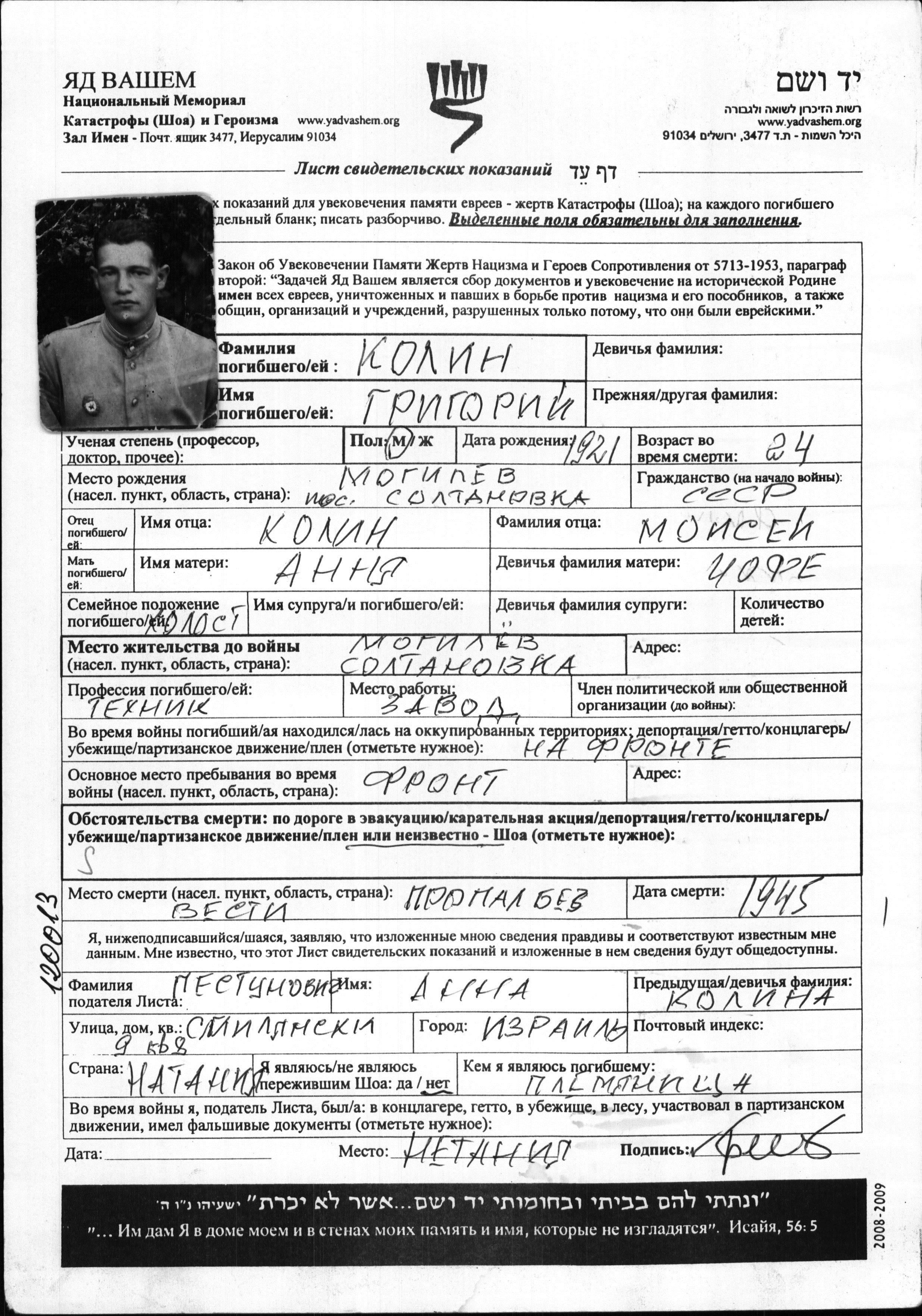 Kolin | Grigoriy | 1921 | Soltanovka, Weißrussland (UdSSR) | Gedenkblatt |