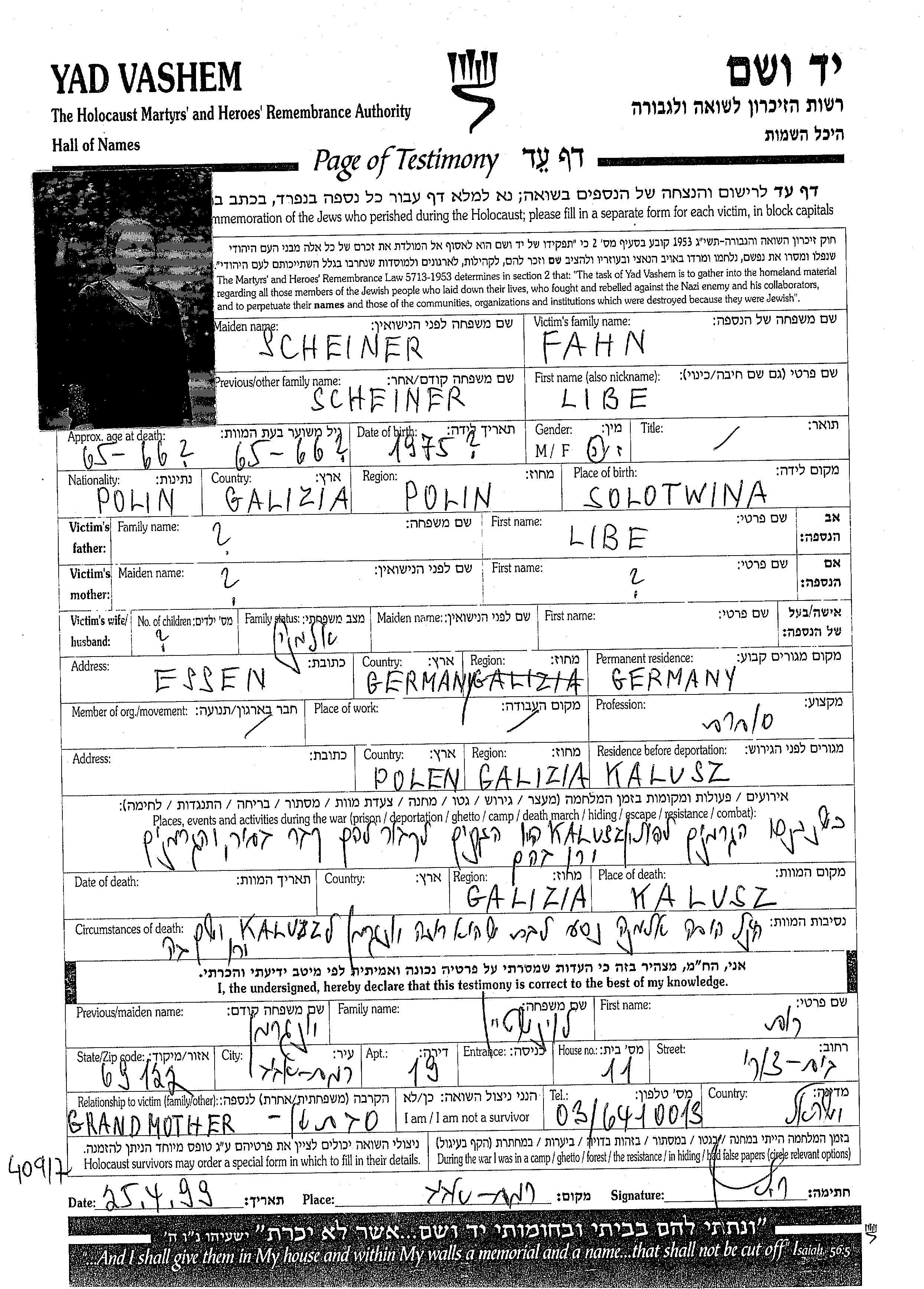 Liba Fahn, geb. Sheiner wurde im Jahr 1875 in Solotwina, Polen geboren. Sie war Kaufmann/-frau. Vor dem Zweiten Weltkrieg lebte sie in Essen, Deutsches Reich.
