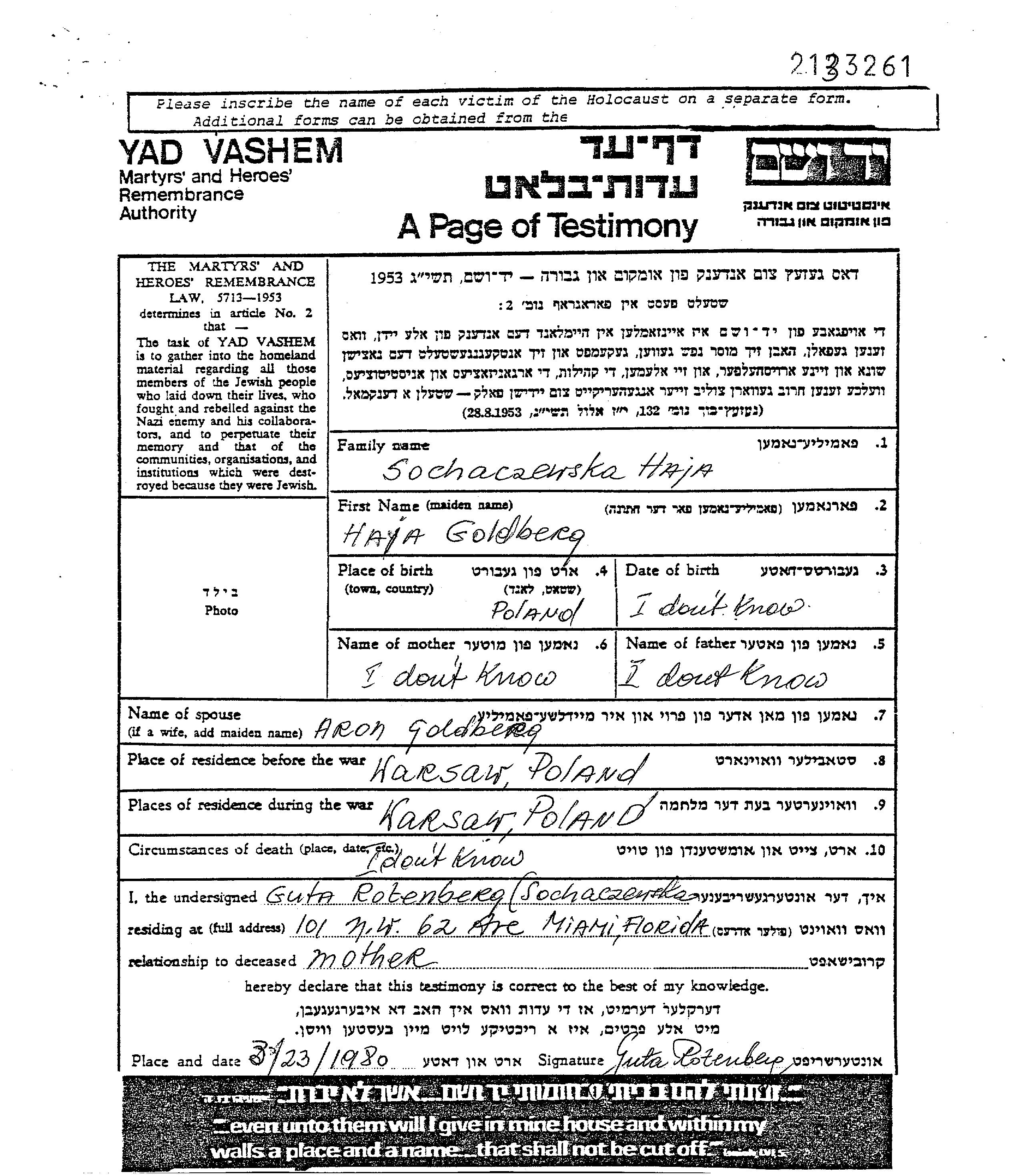 Haia Sochaczewski, geb. Goldberg wurde in Polen geboren. Sie war mit Aron Verheiratet. Vor dem Zweiten Weltkrieg lebte sie in Warszawa, Polen. Während des Krieges war sie in Warszawa, Polen.