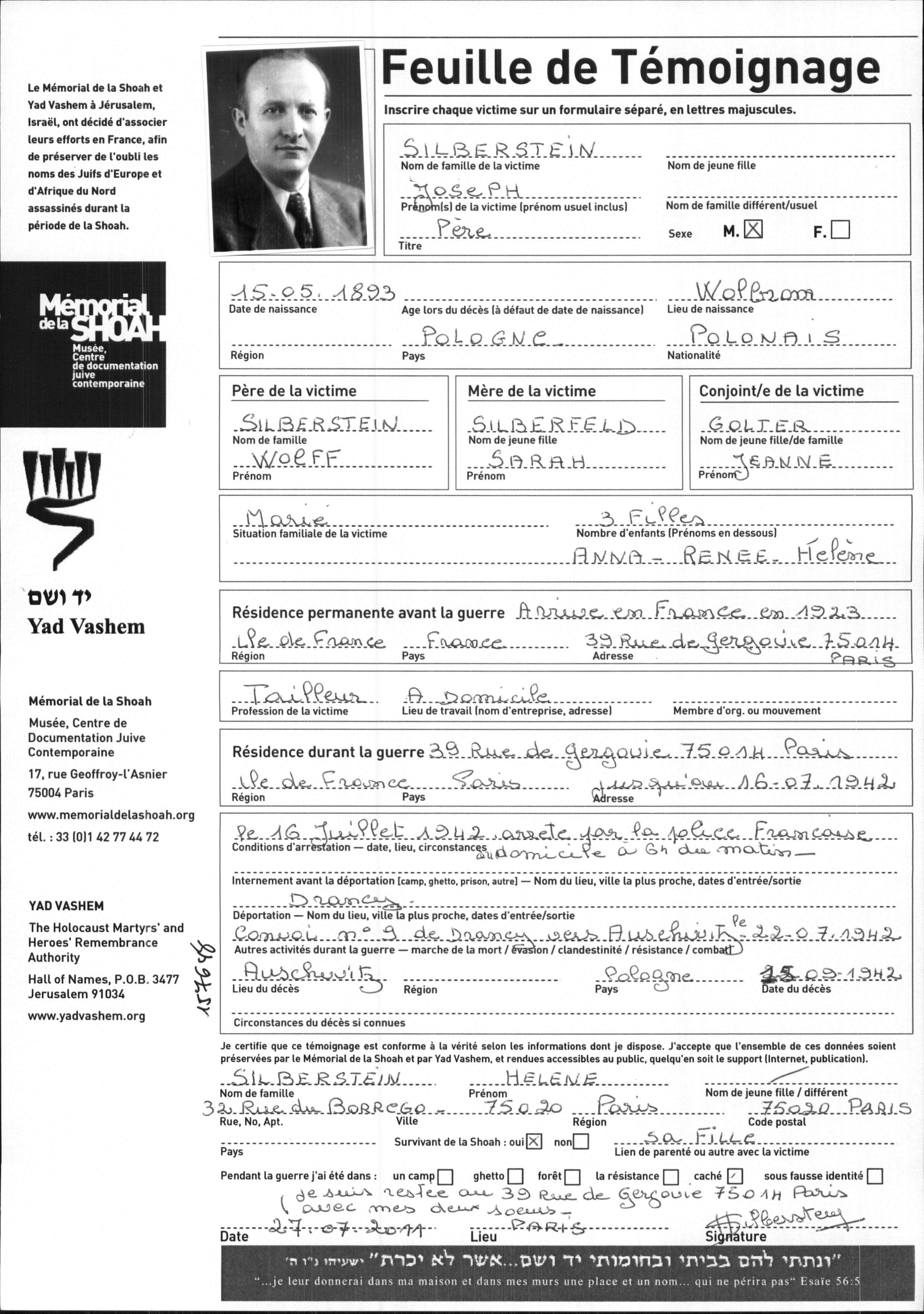 Joseph Silberstein wurde im Jahr 1893 in Polen geboren. Er war Schneider. Vor dem Zweiten Weltkrieg lebte er in Paris, Frankreich.