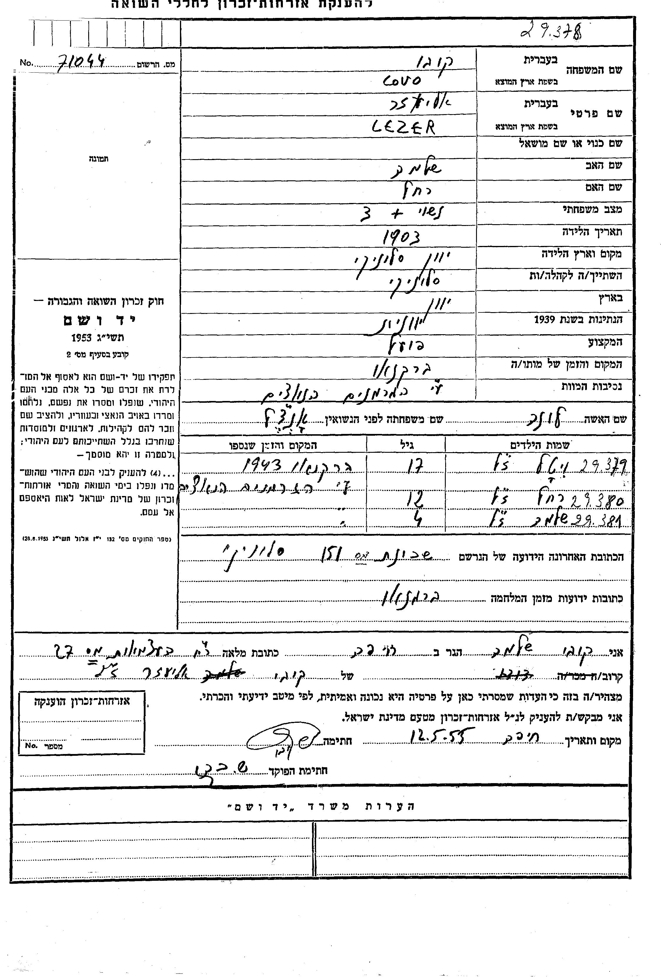 Lazer Kovo wurde in Thessaloniki, Griechenland geboren. Er war Fabrikarbeiter/in. Vor dem Zweiten Weltkrieg lebte er in Thessaloniki, Griechenland.