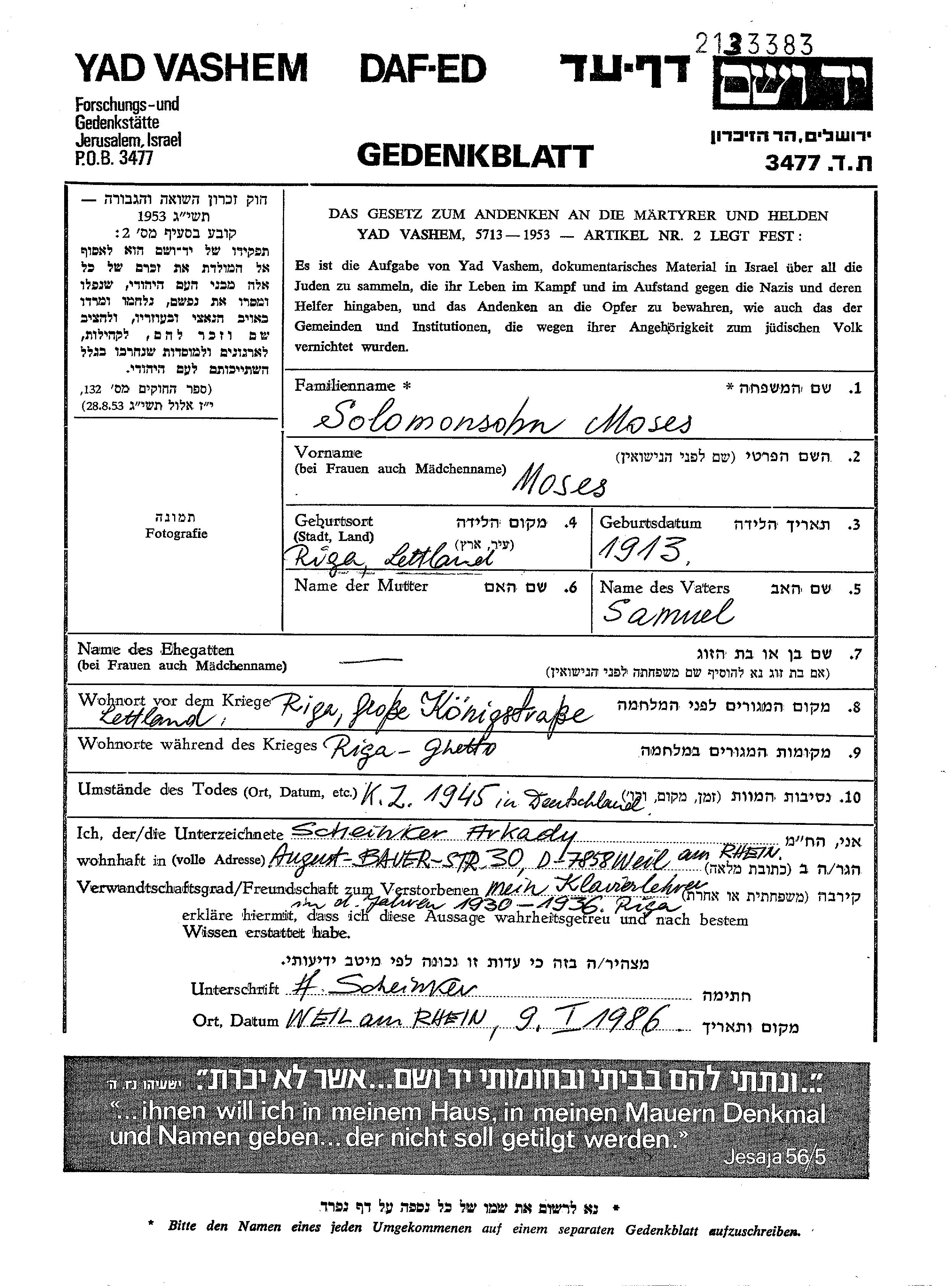 Solomonsohn Moses Riga, Lettland Gedenkblatt