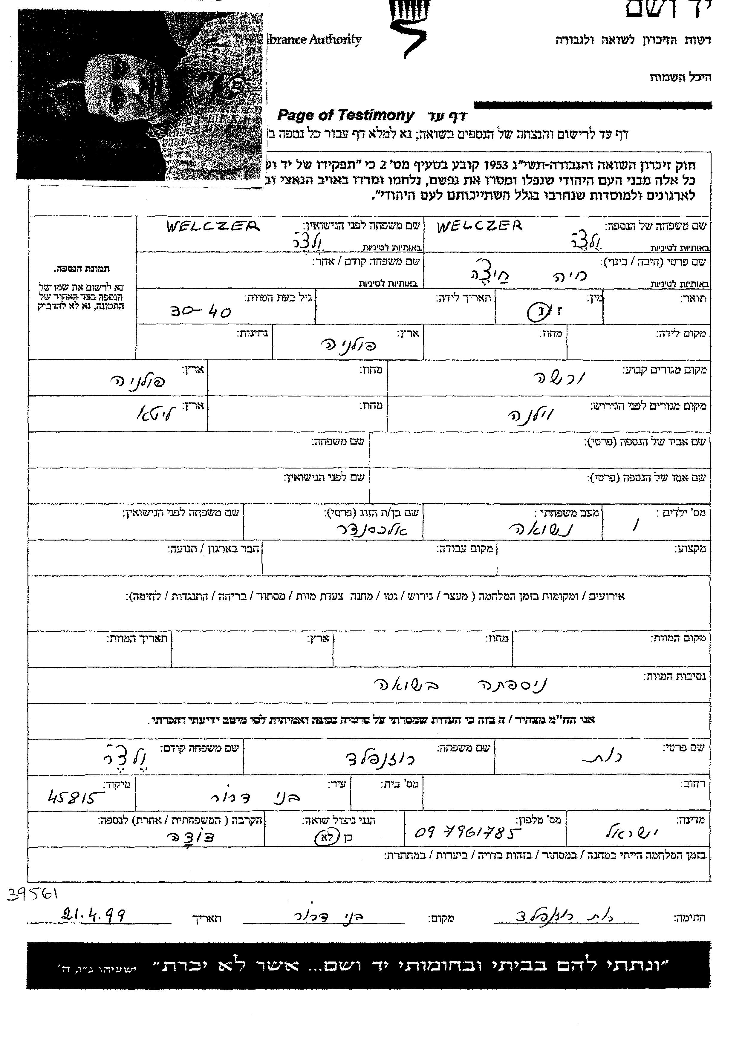 Khaia Welczer, geb. Welczer wurde in Polen geboren. Vor dem Zweiten Weltkrieg lebte sie in Warszawa, Polen.