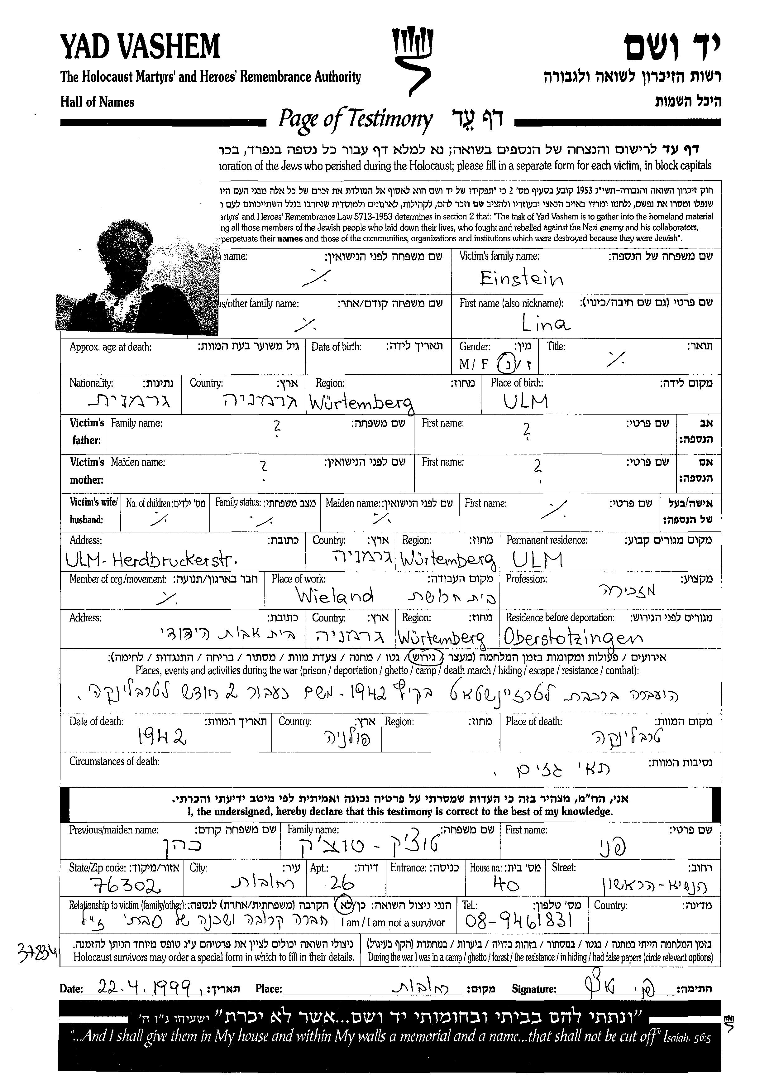 Lina Einstein wurde in Ulm Donau, Deutsches Reich geboren. Sie war Sekretärin. Vor dem Zweiten Weltkrieg lebte sie in Ulm Donau, Deutsches Reich.