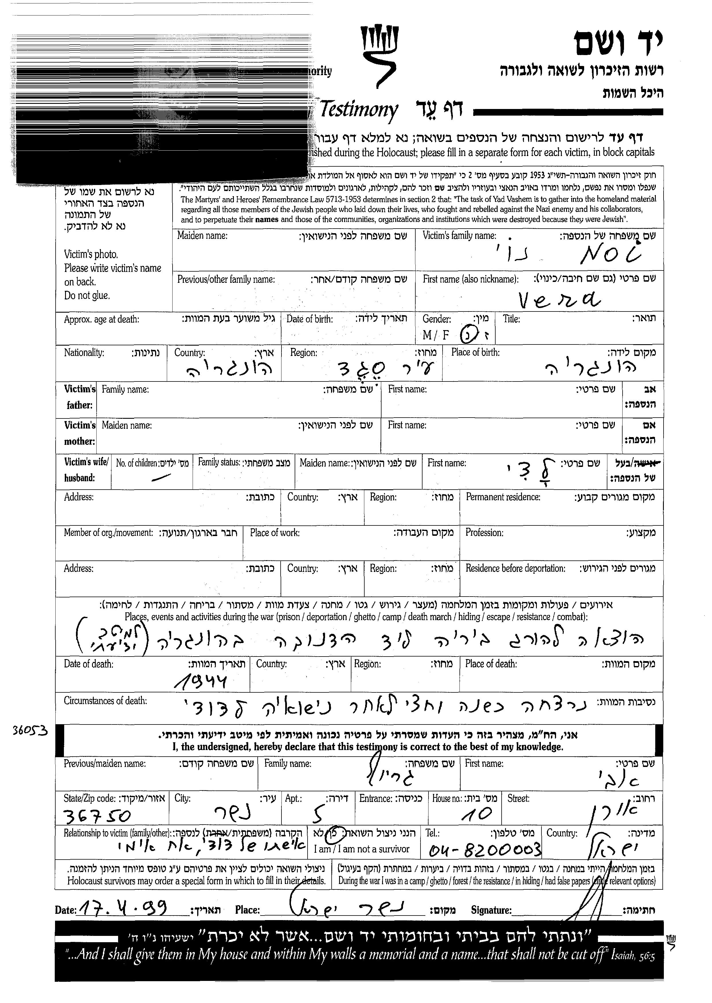 | Noj | Vera | unbekannter Ort, | Gedenkblatt | |