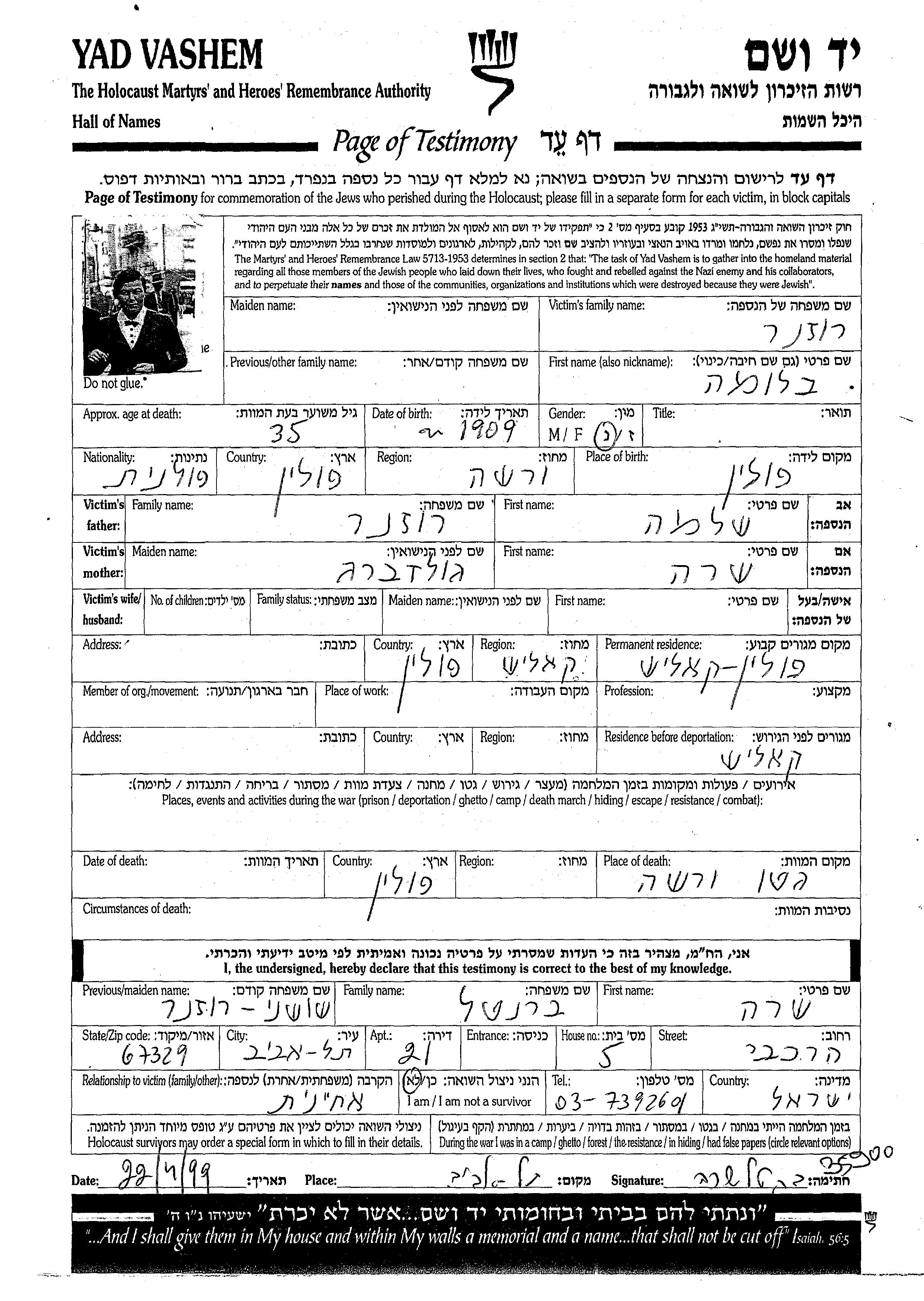 Bluma Rozner wurde im Jahr 1909 in Warszawa, Polen geboren. Vor dem Zweiten Weltkrieg lebte sie in Kalisz, Polen.