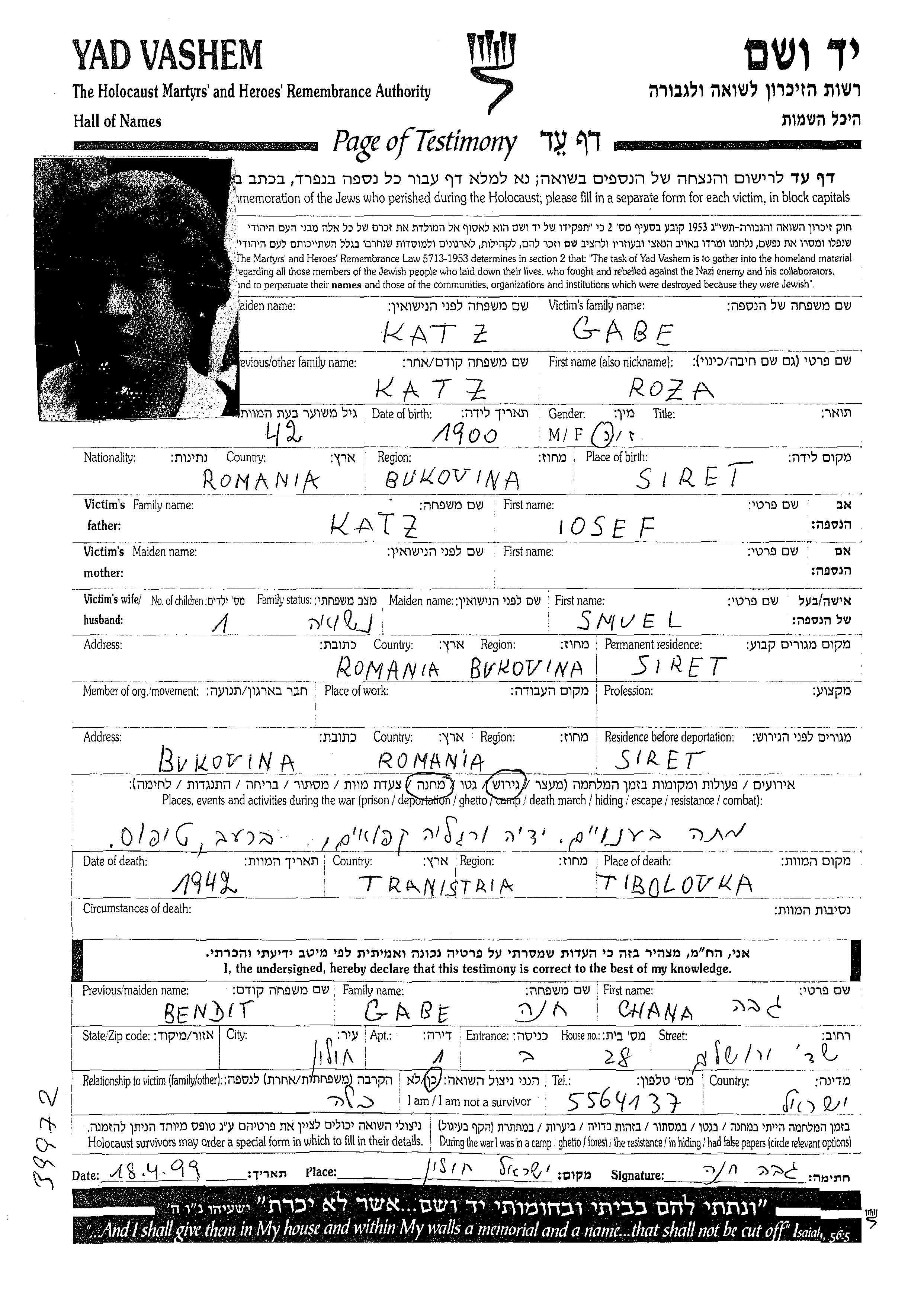 Roza Gabe, geb. Katz wurde im Jahr 1900 in Siret, Rumänien geboren. Vor dem Zweiten Weltkrieg lebte sie in Siret, Rumänien.