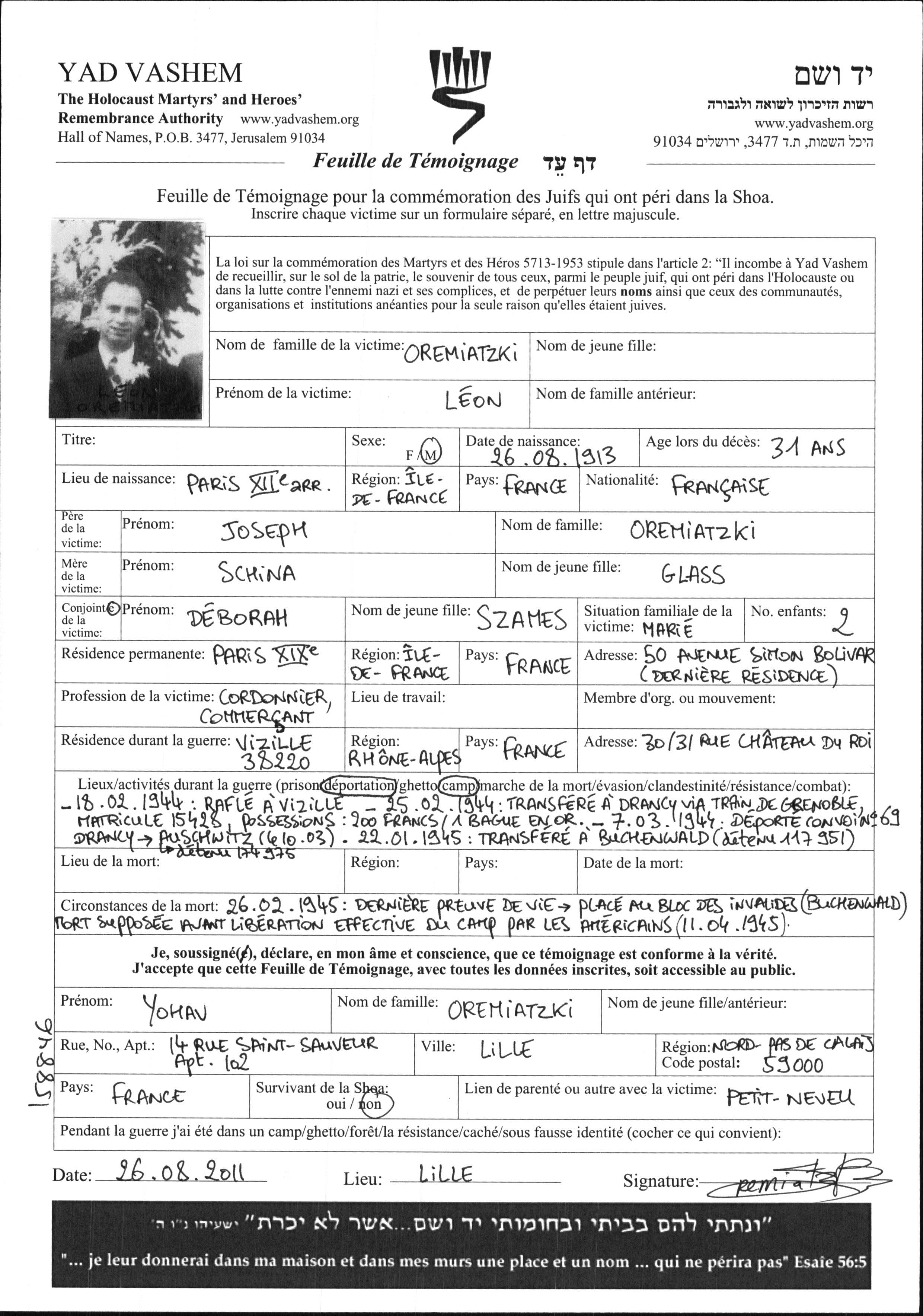 Leon Oremiatzki wurde im Jahr 1913 in Paris, Frankreich geboren. Er war Kaufmann/-frau. Vor dem Zweiten Weltkrieg lebte er in Paris, Frankreich.