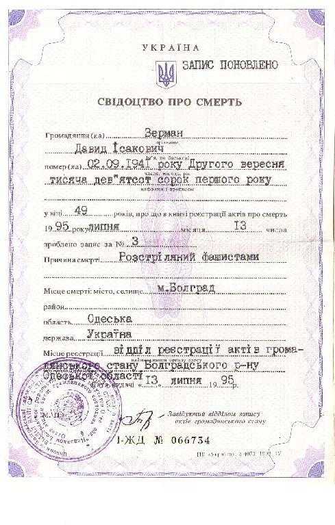 David Zerman wurde in Bolgrad, Rumänien geboren. Vor dem Zweiten Weltkrieg lebte er in Bolgrad, Rumänien. David wurde in der Schoah ermordet. Todesort: Tabacu, Rumänien im Jahr 02/09/1941.