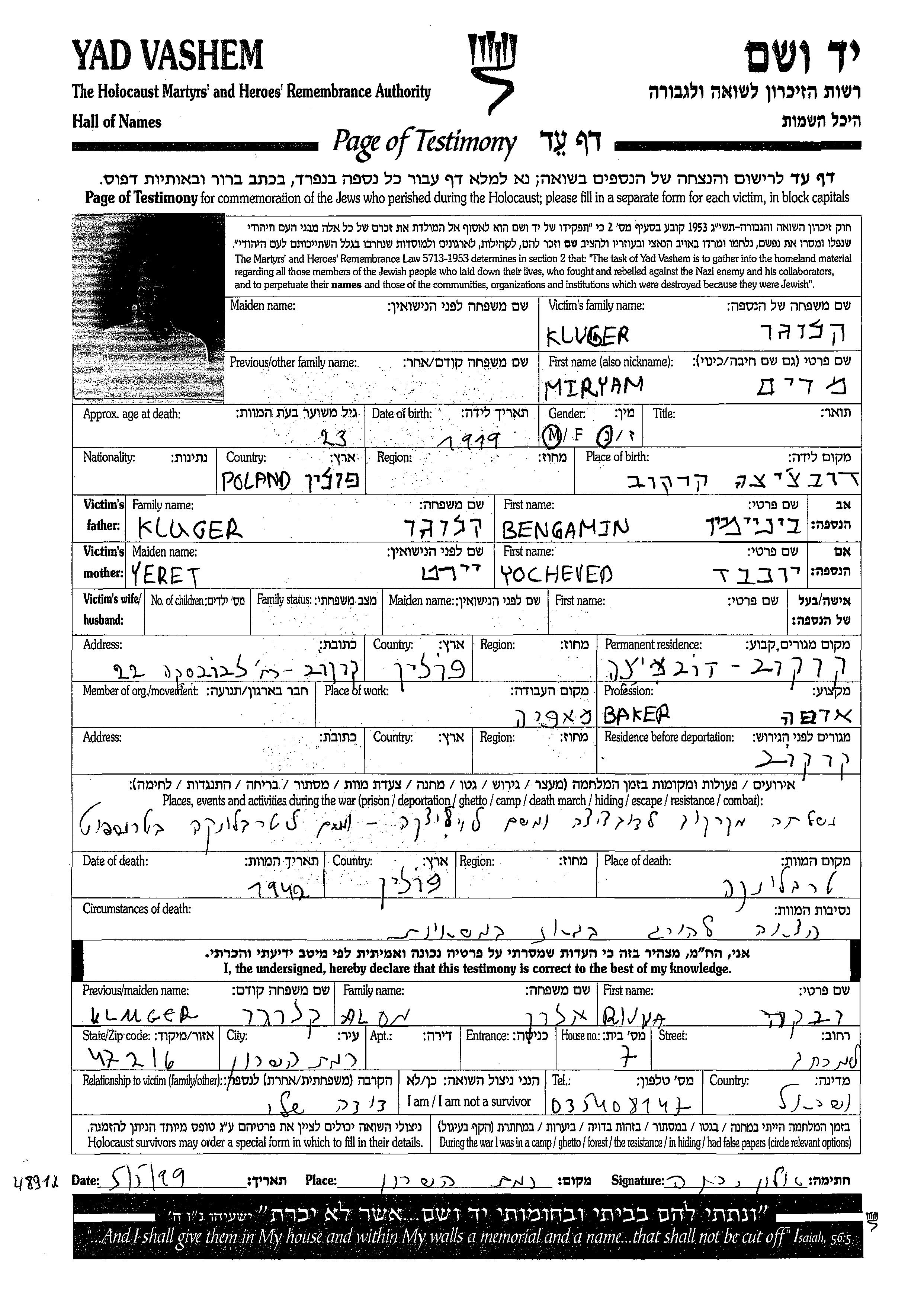 Miryam Kluger wurde im Jahr 1919 in Dobczyce, Polen geboren. Sie war Bäcker/-in. Vor dem Zweiten Weltkrieg lebte sie in Dobczyce, Polen.